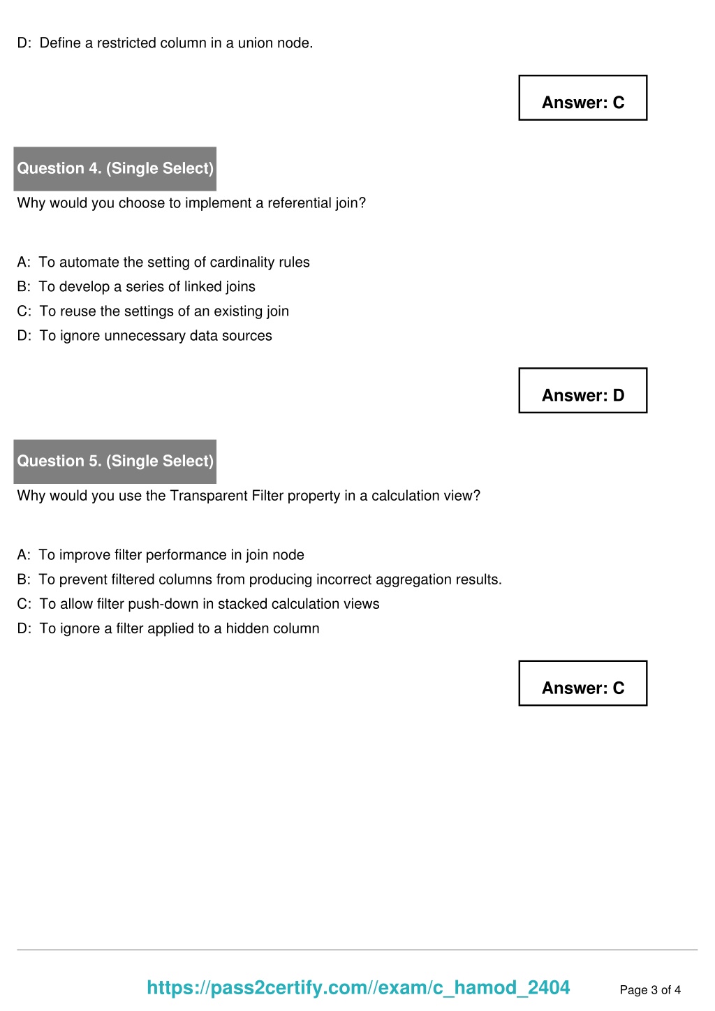 D: Define a restricted column in a union node. Answer: C Question 4. (Single Select) Why would you choose to implement a referential join? A: To automate the setting of cardinality rules B: To develop a series of linked joins C: To reuse the settings of an existing join D: To ignore unnecessary data sources Answer: D Question 5. (Single Select) Why would you use the Transparent Filter property in a calculation view? A: To improve filter performance in join node B: To prevent filtered columns from producing incorrect aggregation results. C: To allow filter push-down in stacked calculation views D: To ignore a filter applied to a hidden column Answer: C https://pass2certify.com//exam/c_hamod_2404 Page 3 of 4