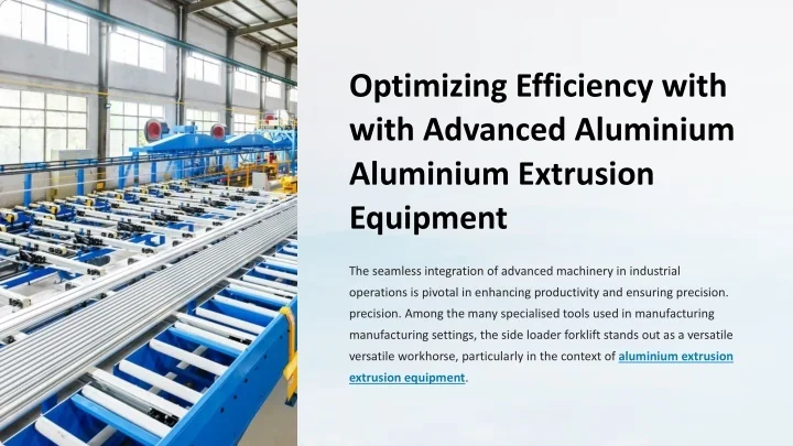 The seamless integration of advanced machinery in industrial operations is pivotal in enhancing productivity and ensuring precision. Among the many specialised tools used in manufacturing settings, the side loader forklift stands out as a versatile workhorse, particularly in the context of aluminium extrusion equipment.<br><br>