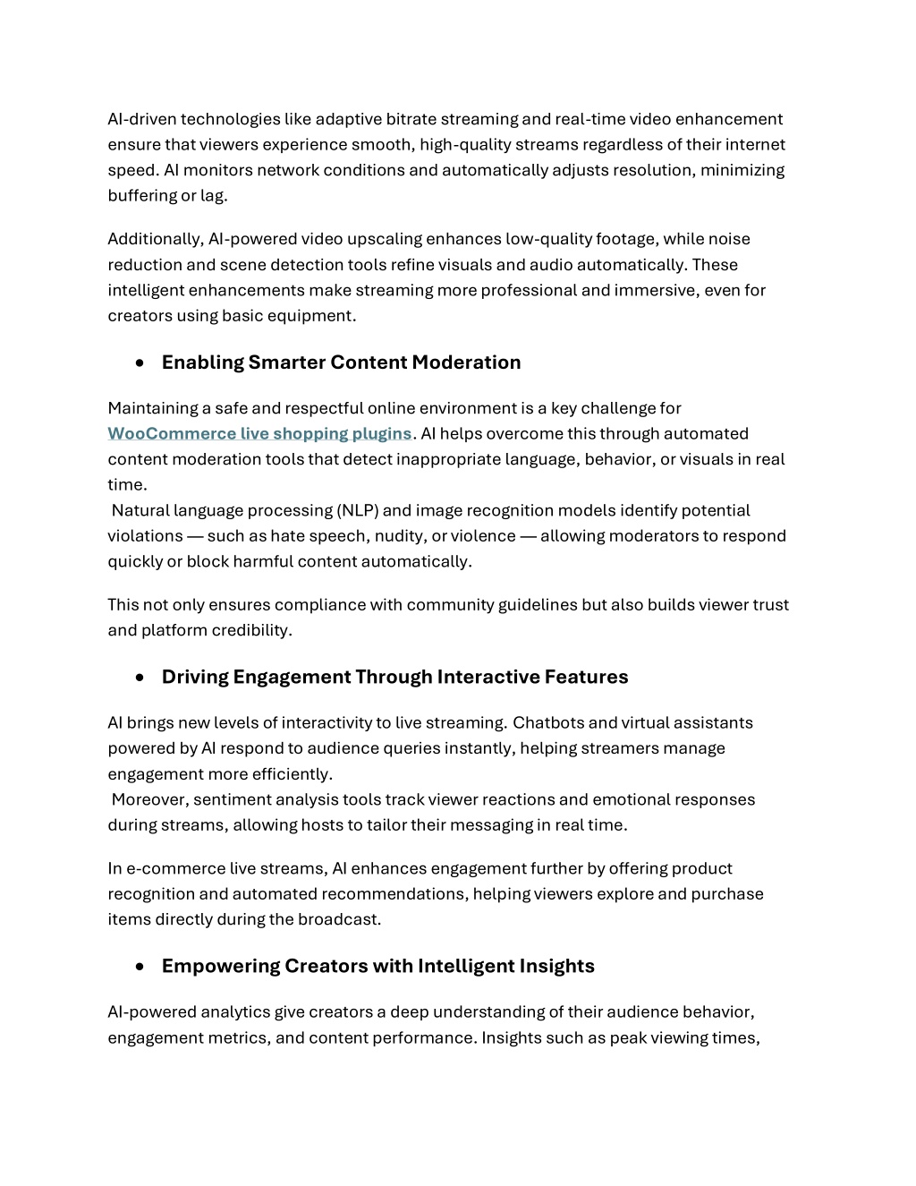 AI-driven technologies like adaptive bitrate streaming and real-time video enhancement ensure that viewers experience smooth, high-quality streams regardless of their internet speed. AI monitors network conditions and automatically adjusts resolution, minimizing buffering or lag. Additionally, AI-powered video upscaling enhances low-quality footage, while noise reduction and scene detection tools refine visuals and audio automatically. These intelligent enhancements make streaming more professional and immersive, even for creators using basic equipment. •Enabling Smarter Content Moderation Maintaining a safe and respectful online environment is a key challenge for WooCommerce live shopping plugins. AI helps overcome this through automated content moderation tools that detect inappropriate language, behavior, or visuals in real time. Natural language processing (NLP) and image recognition models identify potential violations — such as hate speech, nudity, or violence — allowing moderators to respond quickly or block harmful content automatically. This not only ensures compliance with community guidelines but also builds viewer trust and platform credibility. •Driving Engagement Through Interactive Features AI brings new levels of interactivity to live streaming. Chatbots and virtual assistants powered by AI respond to audience queries instantly, helping streamers manage engagement more efficiently. Moreover, sentiment analysis tools track viewer reactions and emotional responses during streams, allowing hosts to tailor their messaging in real time. In e-commerce live streams, AI enhances engagement further by offering product recognition and automated recommendations, helping viewers explore and purchase items directly during the broadcast. •Empowering Creators with Intelligent Insights AI-powered analytics give creators a deep understanding of their audience behavior, engagement metrics, and content performance. Insights such as peak viewing times,
