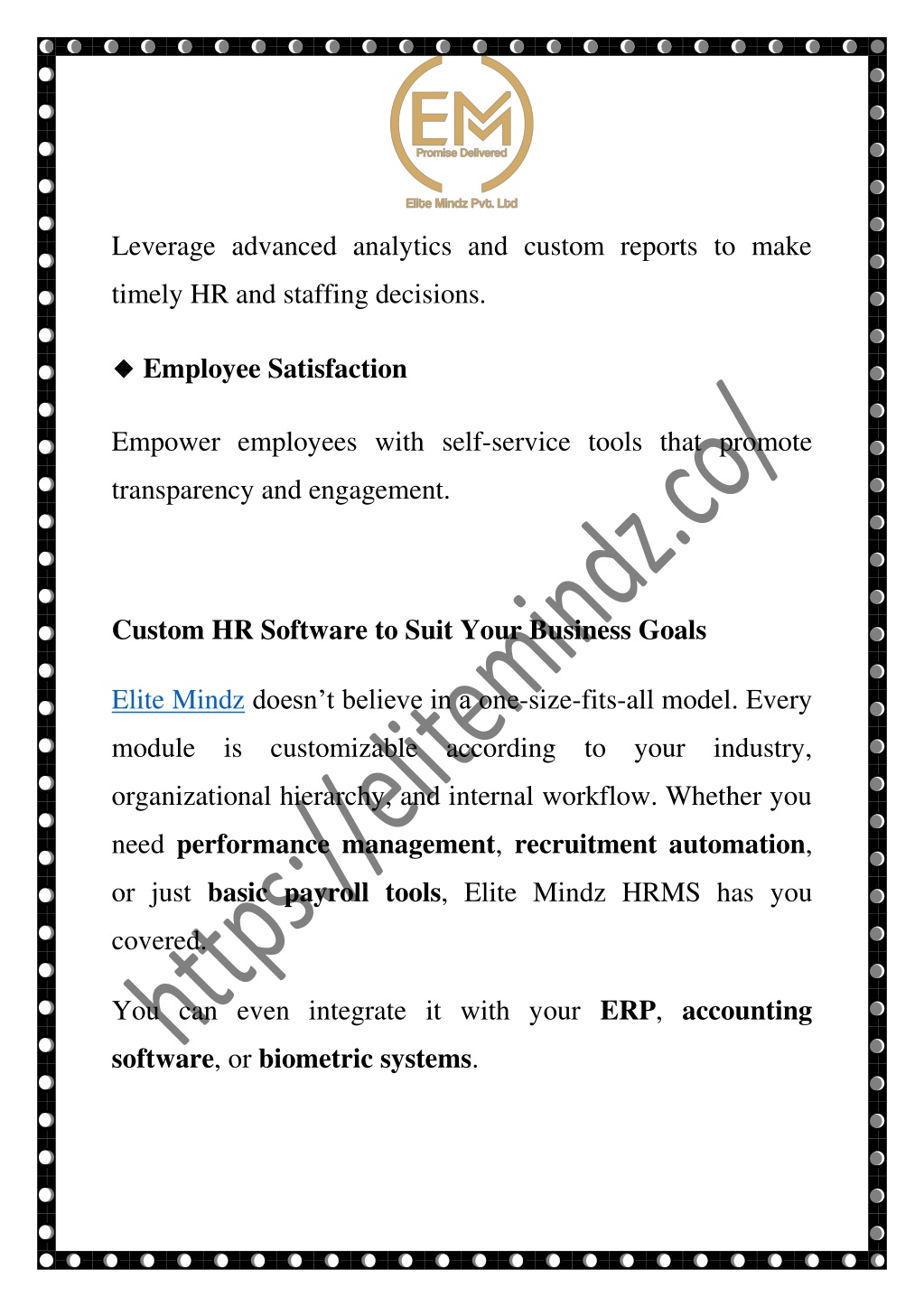 Leverage advanced analytics and custom reports to make timely HR and staffing decisions. ? ? Employee Satisfaction Empower employees with self-service tools that promote transparency and engagement. Custom HR Software to Suit Your Business Goals Elite Mindz doesn’t believe in a one-size-fits-all model. Every module is customizable according to your industry, organizational hierarchy, and internal workflow. Whether you need performance management, recruitment automation, or just basic payroll tools, Elite Mindz HRMS has you covered. You can even integrate it with your ERP, accounting software, or biometric systems.
