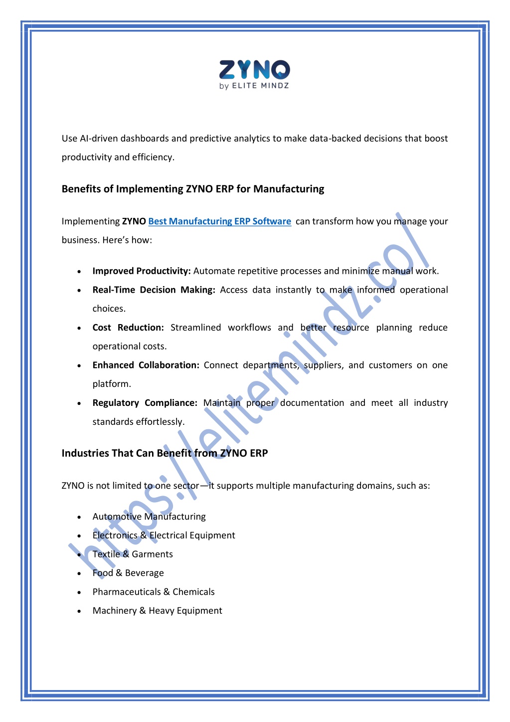 Whether you’re into discrete manufacturing or process manufacturing, ZYNO adapts to your needs. Why ZYNO is the Best ERP for Manufacturing in India When it comes to the Best ERP System For Manufacturing, ZYNO by Elite Mindz is a trusted choice among top manufacturing brands. Its robust cloud-based framework, AI analytics, and industry-specific customization make it the best manufacturing ERP software for modern businesses aiming for digital transformation. Cloud-Based Manufacturing ERP Software: The Future of Industry 4.0 With digital transformation reshaping industries, cloud ERP solutions are becoming a must- have. ZYNO Cloud Based Manufacturing ERP Software helps you achieve Industry 4.0 standards with IoT integration, real-time analytics, and mobility. Access your data securely from anywhere and keep your production cycle running without interruption. Final Thoughts In an era where agility and innovation define success, adopting an advanced ERP like ZYNO by Elite Mindz can revolutionize your manufacturing processes. From managing resources to tracking production and ensuring quality, ZYNO offers everything under one intelligent cloud- based system. If you’re searching for the ERP manufacturing software that ensures scalability, automation, and cost efficiency, ZYNO by Elite Mindz is the solution your business needs.