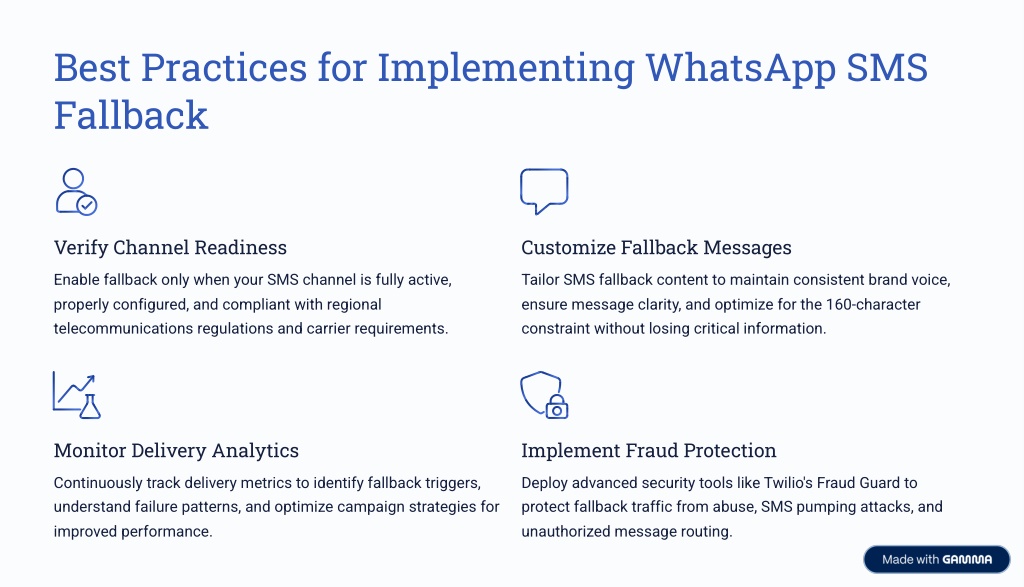 Best Practices for Implementing WhatsApp SMS Fallback Verify Channel Readiness Customize Fallback Messages Enable fallback only when your SMS channel is fully active, properly configured, and compliant with regional telecommunications regulations and carrier requirements. Tailor SMS fallback content to maintain consistent brand voice, ensure message clarity, and optimize for the 160-character constraint without losing critical information. Monitor Delivery Analytics Implement Fraud Protection Continuously track delivery metrics to identify fallback triggers, understand failure patterns, and optimize campaign strategies for improved performance. Deploy advanced security tools like Twilio's Fraud Guard to protect fallback traffic from abuse, SMS pumping attacks, and unauthorized message routing.