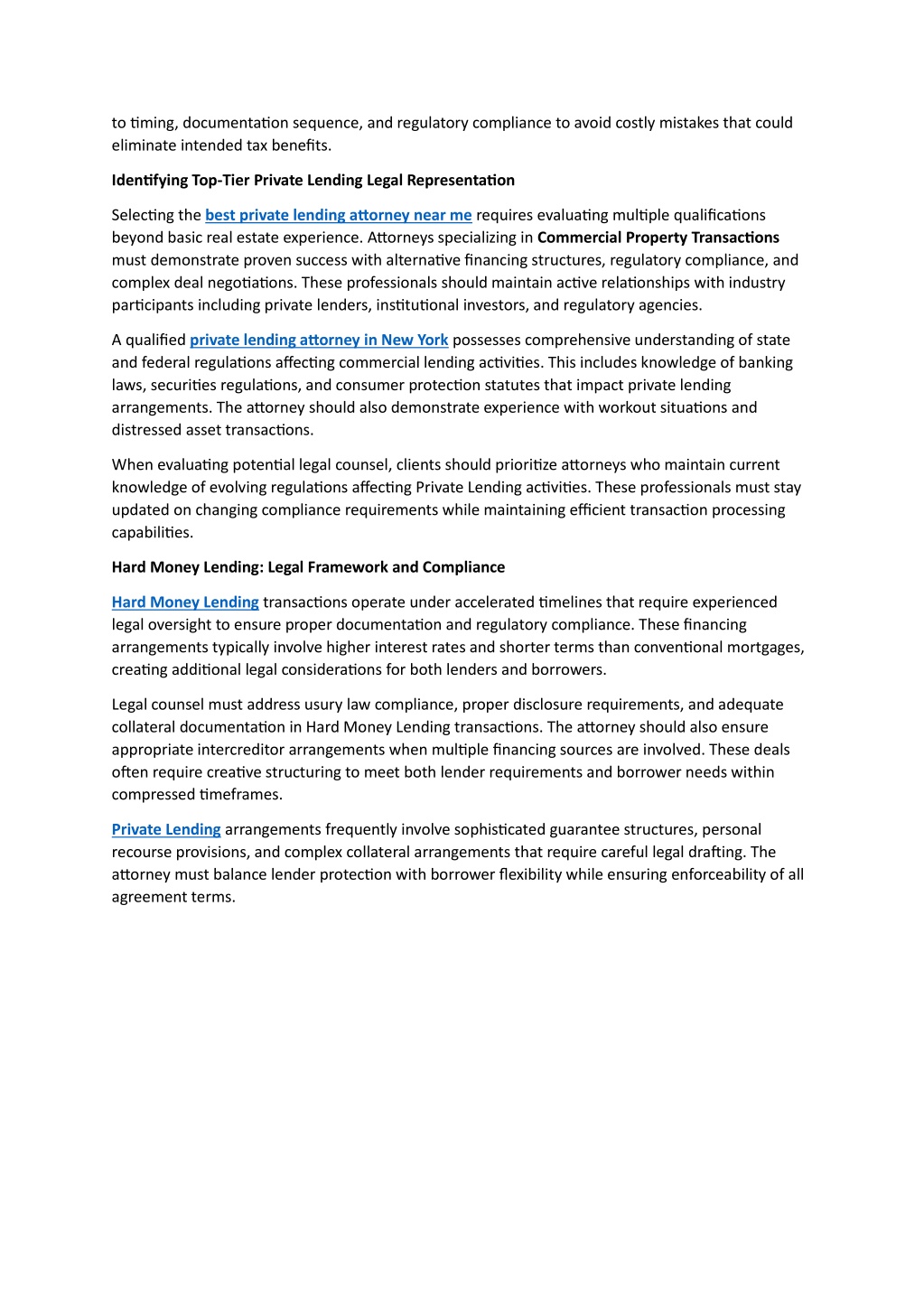 to timing, documentation sequence, and regulatory compliance to avoid costly mistakes that could eliminate intended tax benefits. Identifying Top-Tier Private Lending Legal Representation Selecting the best private lending attorney near me requires evaluating multiple qualifications beyond basic real estate experience. Attorneys specializing in Commercial Property Transactions must demonstrate proven success with alternative financing structures, regulatory compliance, and complex deal negotiations. These professionals should maintain active relationships with industry participants including private lenders, institutional investors, and regulatory agencies. A qualified private lending attorney in New York possesses comprehensive understanding of state and federal regulations affecting commercial lending activities. This includes knowledge of banking laws, securities regulations, and consumer protection statutes that impact private lending arrangements. The attorney should also demonstrate experience with workout situations and distressed asset transactions. When evaluating potential legal counsel, clients should prioritize attorneys who maintain current knowledge of evolving regulations affecting Private Lending activities. These professionals must stay updated on changing compliance requirements while maintaining efficient transaction processing capabilities. Hard Money Lending: Legal Framework and Compliance Hard Money Lending transactions operate under accelerated timelines that require experienced legal oversight to ensure proper documentation and regulatory compliance. These financing arrangements typically involve higher interest rates and shorter terms than conventional mortgages, creating additional legal considerations for both lenders and borrowers. Legal counsel must address usury law compliance, proper disclosure requirements, and adequate collateral documentation in Hard Money Lending transactions. The attorney should also ensure appropriate intercreditor arrangements when multiple financing sources are involved. These deals often require creative structuring to meet both lender requirements and borrower needs within compressed timeframes. Private Lending arrangements frequently involve sophisticated guarantee structures, personal recourse provisions, and complex collateral arrangements that require careful legal drafting. The attorney must balance lender protection with borrower flexibility while ensuring enforceability of all agreement terms.