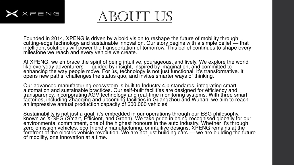 About us Founded in 2014, XPENG is driven by a bold vision to reshape the future of mobility through cutting-edge technology and sustainable innovation. Our story begins with a simple belief — that intelligent solutions will power the transportation of tomorrow. This belief continues to shape every milestone we reach and every vehicle we create. At XPENG, we embrace the spirit of being intuitive, courageous, and lively. We explore the world like everyday adventurers — guided by insight, inspired by imagination, and committed to enhancing the way people move. For us, technology is not just functional; it’s transformative. It opens new paths, challenges the status quo, and invites smarter ways of thinking. Our advanced manufacturing ecosystem is built to Industry 4.0 standards, integrating smart automation and sustainable practices. Our self-built facilities are designed for efficiency and transparency, incorporating AGV technology and real-time monitoring systems. With three smart factories, including Zhaoqing and upcoming facilities in Guangzhou and Wuhan, we aim to reach an impressive annual production capacity of 600,000 vehicles. Sustainability is not just a goal, it’s embedded in our operations through our ESG philosophy, known as X-SEG (Smart, Efficient, and Green). We take pride in being recognised globally for our environmental commitment, one of the highest honours in the auto industry. Whether it's through zero-emission vehicles, eco-friendly manufacturing, or intuitive designs, XPENG remains at the forefront of the electric vehicle revolution. We are not just building cars — we are building the future of mobility, one innovation at a time.