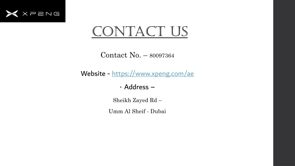 Contact Us Contact No. – 80097364 Website - https://www.xpeng.com/ae • Address – Sheikh Zayed Rd – Umm Al Sheif - Dubai