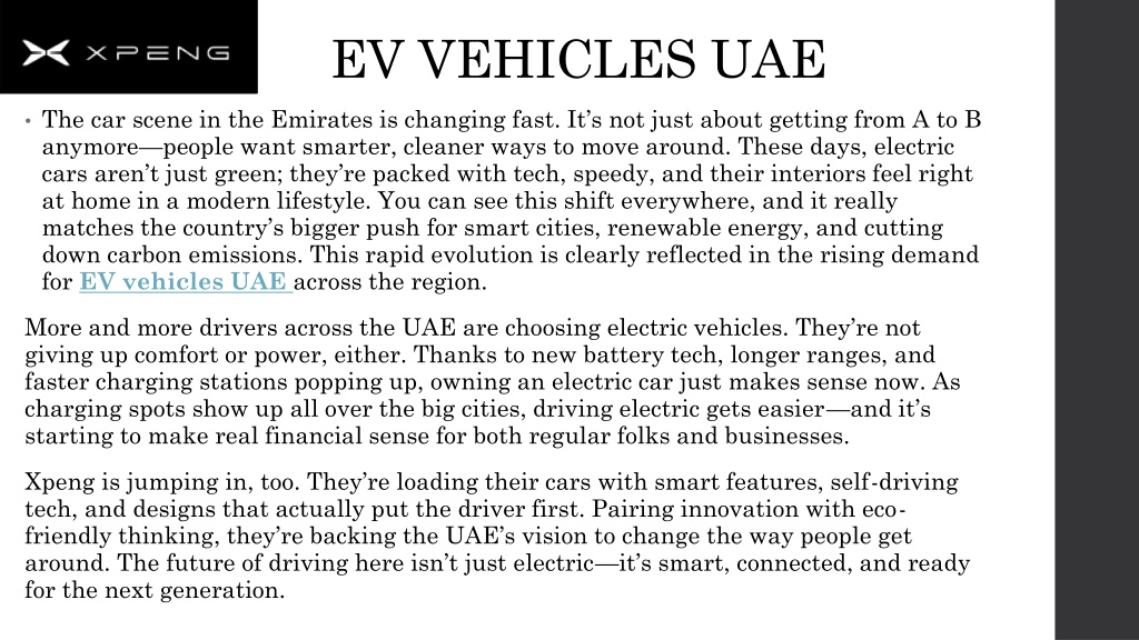 EV VEHICLES UAE • The car scene in the Emirates is changing fast. It’s not just about getting from A to B anymore—people want smarter, cleaner ways to move around. These days, electric cars aren’t just green; they’re packed with tech, speedy, and their interiors feel right at home in a modern lifestyle. You can see this shift everywhere, and it really matches the country’s bigger push for smart cities, renewable energy, and cutting down carbon emissions. This rapid evolution is clearly reflected in the rising demand for EV vehicles UAE across the region. More and more drivers across the UAE are choosing electric vehicles. They’re not giving up comfort or power, either. Thanks to new battery tech, longer ranges, and faster charging stations popping up, owning an electric car just makes sense now. As charging spots show up all over the big cities, driving electric gets easier—and it’s starting to make real financial sense for both regular folks and businesses. Xpeng is jumping in, too. They’re loading their cars with smart features, self-driving tech, and designs that actually put the driver first. Pairing innovation with eco-friendly thinking, they’re backing the UAE’s vision to change the way people get around. The future of driving here isn’t just electric—it’s smart, connected, and ready for the next generation.