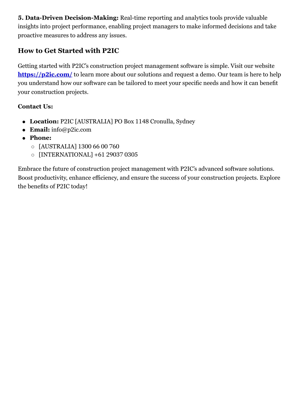 5. Data-Driven Decision-Making: Real-time reporting and analytics tools provide valuable insights into project performance, enabling project managers to make informed decisions and take proactive measures to address any issues. How to Get Started with P2IC Getting started with P2IC’s construction project management software is simple. Visit our website https://p2ic.com/ to learn more about our solutions and request a demo. Our team is here to help you understand how our software can be tailored to meet your specific needs and how it can benefit your construction projects. Contact Us: Location: P2IC [AUSTRALIA] PO Box 1148 Cronulla, Sydney Email: info@p2ic.com Phone: [AUSTRALIA] 1300 66 00 760 [INTERNATIONAL] +61 29037 0305 Embrace the future of construction project management with P2IC’s advanced software solutions. Boost productivity, enhance efficiency, and ensure the success of your construction projects. Explore the benefits of P2IC today!