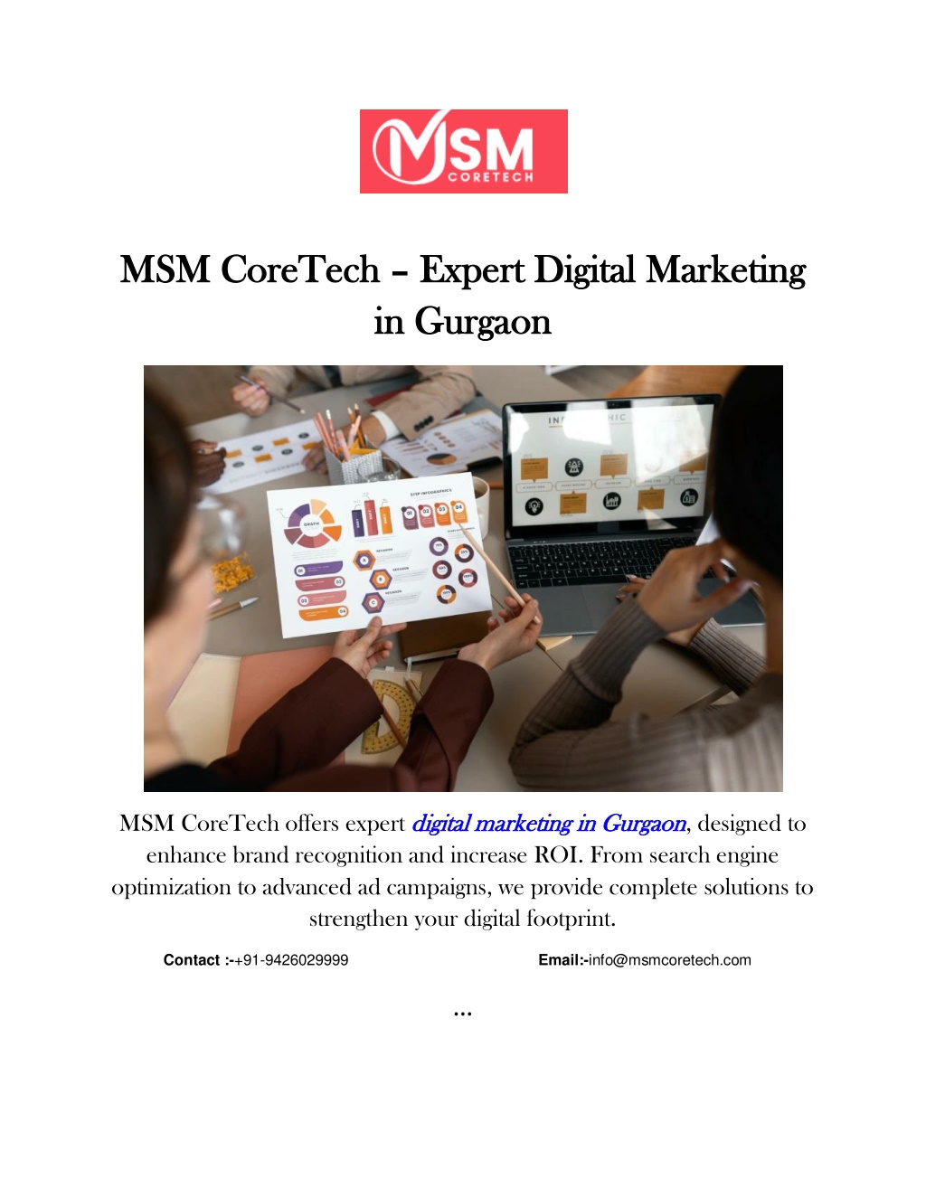 MSM CoreTech MSM CoreTech – – Expert Digital Marketing Expert Digital Marketing in Gurgaon in Gurgaon MSM CoreTech offers expert digital marketing in Gurgaon enhance brand recognition and increase ROI. From search engine optimization to advanced ad campaigns, we provide complete solutions to strengthen your digital footprint. digital marketing in Gurgaon, designed to Contact :-+91-9426029999 Email:-info@msmcoretech.com …