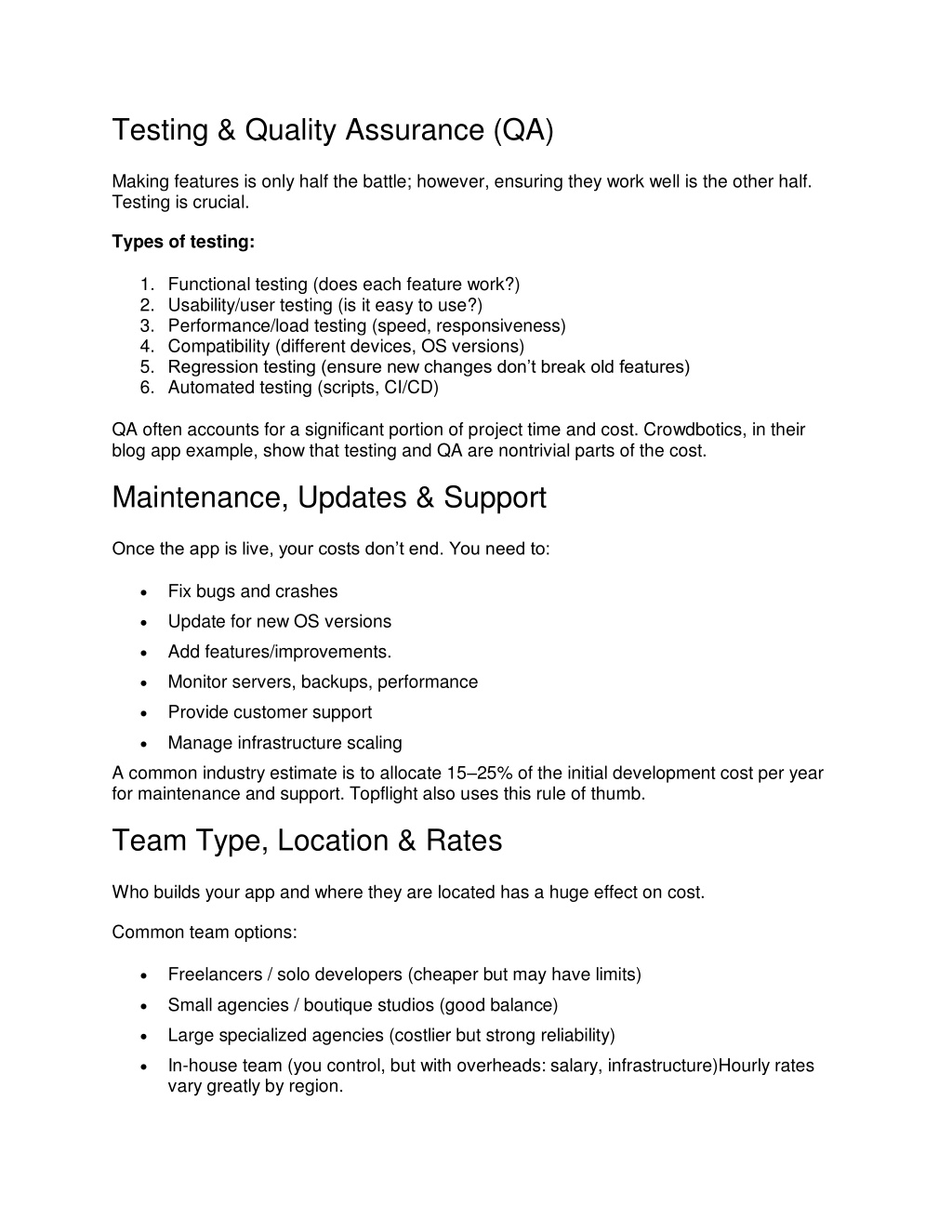 Testing & Quality Assurance (QA) Making features is only half the battle; however, ensuring they work well is the other half. Testing is crucial. Types of testing: 1. Functional testing (does each feature work?) 2. Usability/user testing (is it easy to use?) 3. Performance/load testing (speed, responsiveness) 4. Compatibility (different devices, OS versions) 5. Regression testing (ensure new changes don’t break old features) 6. Automated testing (scripts, CI/CD) QA often accounts for a significant portion of project time and cost. Crowdbotics, in their blog app example, show that testing and QA are nontrivial parts of the cost. Maintenance, Updates & Support Once the app is live, your costs don’t end. You need to: Fix bugs and crashes Update for new OS versions Add features/improvements. Monitor servers, backups, performance Provide customer support Manage infrastructure scaling A common industry estimate is to allocate 15–25% of the initial development cost per year for maintenance and support. Topflight also uses this rule of thumb. Team Type, Location & Rates Who builds your app and where they are located has a huge effect on cost. Common team options: Freelancers / solo developers (cheaper but may have limits) Small agencies / boutique studios (good balance) Large specialized agencies (costlier but strong reliability) In-house team (you control, but with overheads: salary, infrastructure)Hourly rates vary greatly by region.