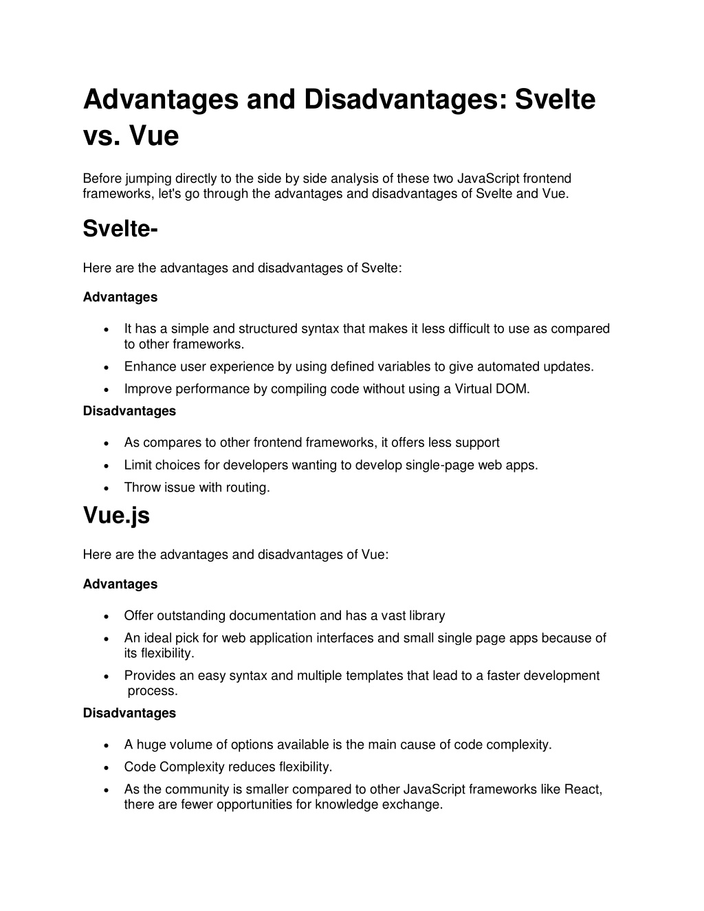 Advantages and Disadvantages: Svelte vs. Vue Before jumping directly to the side by side analysis of these two JavaScript frontend frameworks, let's go through the advantages and disadvantages of Svelte and Vue. Svelte- Here are the advantages and disadvantages of Svelte: Advantages It has a simple and structured syntax that makes it less difficult to use as compared to other frameworks. Enhance user experience by using defined variables to give automated updates. Improve performance by compiling code without using a Virtual DOM. Disadvantages As compares to other frontend frameworks, it offers less support Limit choices for developers wanting to develop single-page web apps. Throw issue with routing. Vue.js Here are the advantages and disadvantages of Vue: Advantages Offer outstanding documentation and has a vast library An ideal pick for web application interfaces and small single page apps because of its flexibility. Provides an easy syntax and multiple templates that lead to a faster development process. Disadvantages A huge volume of options available is the main cause of code complexity. Code Complexity reduces flexibility. As the community is smaller compared to other JavaScript frameworks like React, there are fewer opportunities for knowledge exchange.