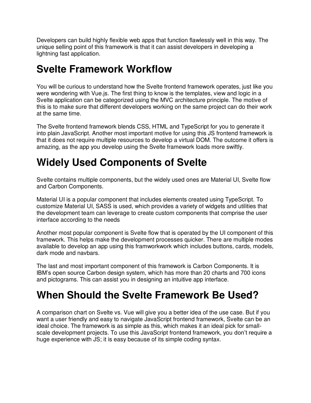 Developers can build highly flexible web apps that function flawlessly well in this way. The unique selling point of this framework is that it can assist developers in developing a lightning fast application. Svelte Framework Workflow You will be curious to understand how the Svelte frontend framework operates, just like you were wondering with Vue.js. The first thing to know is the templates, view and logic in a Svelte application can be categorized using the MVC architecture principle. The motive of this is to make sure that different developers working on the same project can do their work at the same time. The Svelte frontend framework blends CSS, HTML and TypeScript for you to generate it into plain JavaScript. Another most important motive for using this JS frontend framework is that it does not require multiple resources to develop a virtual DOM. The outcome it offers is amazing, as the app you develop using the Svelte framework loads more swiftly. Widely Used Components of Svelte Svelte contains multiple components, but the widely used ones are Material UI, Svelte flow and Carbon Components. Material UI is a popular component that includes elements created using TypeScript. To customize Material UI, SASS is used, which provides a variety of widgets and utilities that the development team can leverage to create custom components that comprise the user interface according to the needs Another most popular component is Svelte flow that is operated by the UI component of this framework. This helps make the development processes quicker. There are multiple modes available to develop an app using this framworkwork which includes buttons, cards, models, dark mode and navbars. The last and most important component of this framework is Carbon Components. It is IBM’s open source Carbon design system, which has more than 20 charts and 700 icons and pictograms. This can assist you in designing an intuitive app interface. When Should the Svelte Framework Be Used? A comparison chart on Svelte vs. Vue will give you a better idea of the use case. But if you want a user friendly and easy to navigate JavaScript frontend framework, Svelte can be an ideal choice. The framework is as simple as this, which makes it an ideal pick for small- scale development projects. To use this JavaScript frontend framework, you don’t require a huge experience with JS; it is easy because of its simple coding syntax.