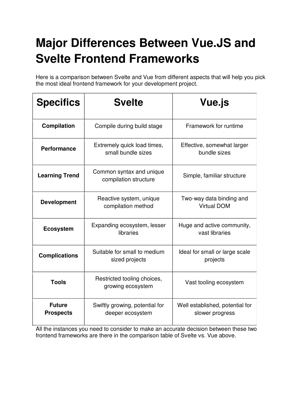 Major Differences Between Vue.JS and Svelte Frontend Frameworks Here is a comparison between Svelte and Vue from different aspects that will help you pick the most ideal frontend framework for your development project. Specifics Svelte Vue.js Compilation Compile during build stage Framework for runtime Extremely quick load times, small bundle sizes Effective, somewhat larger bundle sizes Performance Common syntax and unique compilation structure Learning Trend Simple, familiar structure Reactive system, unique compilation method Two-way data binding and Virtual DOM Development Expanding ecosystem, lesser libraries Huge and active community, vast libraries Ecosystem Suitable for small to medium sized projects Ideal for small or large scale projects Complications Restricted tooling choices, growing ecosystem Tools Vast tooling ecosystem Future Prospects Swiftly growing, potential for deeper ecosystem Well established, potential for slower progress All the instances you need to consider to make an accurate decision between these two frontend frameworks are there in the comparison table of Svelte vs. Vue above.
