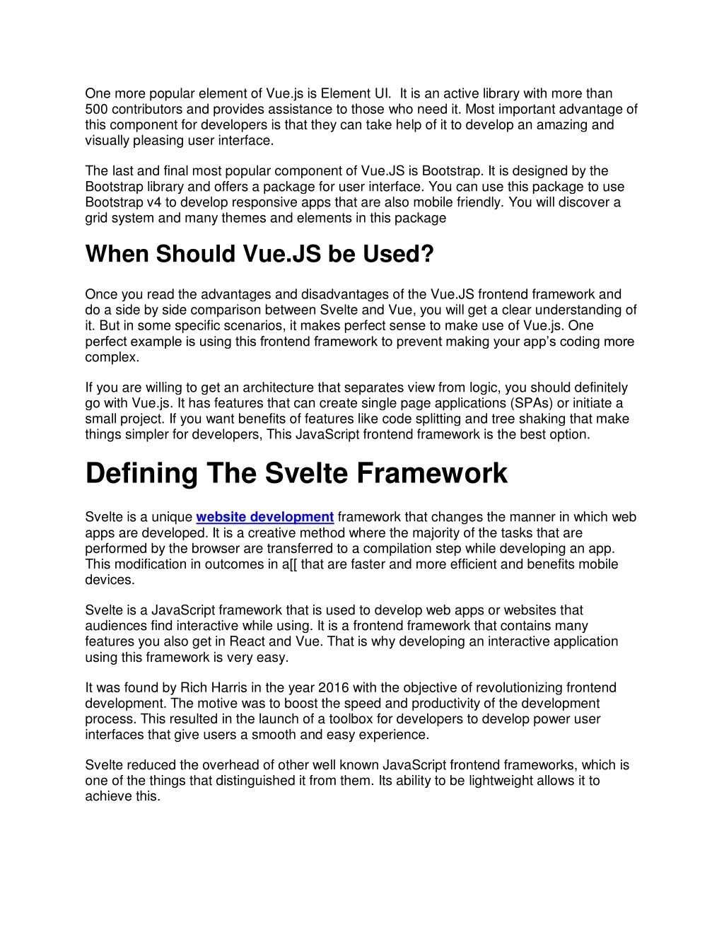 One more popular element of Vue.js is Element UI. It is an active library with more than 500 contributors and provides assistance to those who need it. Most important advantage of this component for developers is that they can take help of it to develop an amazing and visually pleasing user interface. The last and final most popular component of Vue.JS is Bootstrap. It is designed by the Bootstrap library and offers a package for user interface. You can use this package to use Bootstrap v4 to develop responsive apps that are also mobile friendly. You will discover a grid system and many themes and elements in this package When Should Vue.JS be Used? Once you read the advantages and disadvantages of the Vue.JS frontend framework and do a side by side comparison between Svelte and Vue, you will get a clear understanding of it. But in some specific scenarios, it makes perfect sense to make use of Vue.js. One perfect example is using this frontend framework to prevent making your app’s coding more complex. If you are willing to get an architecture that separates view from logic, you should definitely go with Vue.js. It has features that can create single page applications (SPAs) or initiate a small project. If you want benefits of features like code splitting and tree shaking that make things simpler for developers, This JavaScript frontend framework is the best option. Defining The Svelte Framework Svelte is a unique website development framework that changes the manner in which web apps are developed. It is a creative method where the majority of the tasks that are performed by the browser are transferred to a compilation step while developing an app. This modification in outcomes in a[[ that are faster and more efficient and benefits mobile devices. Svelte is a JavaScript framework that is used to develop web apps or websites that audiences find interactive while using. It is a frontend framework that contains many features you also get in React and Vue. That is why developing an interactive application using this framework is very easy. It was found by Rich Harris in the year 2016 with the objective of revolutionizing frontend development. The motive was to boost the speed and productivity of the development process. This resulted in the launch of a toolbox for developers to develop power user interfaces that give users a smooth and easy experience. Svelte reduced the overhead of other well known JavaScript frontend frameworks, which is one of the things that distinguished it from them. Its ability to be lightweight allows it to achieve this.