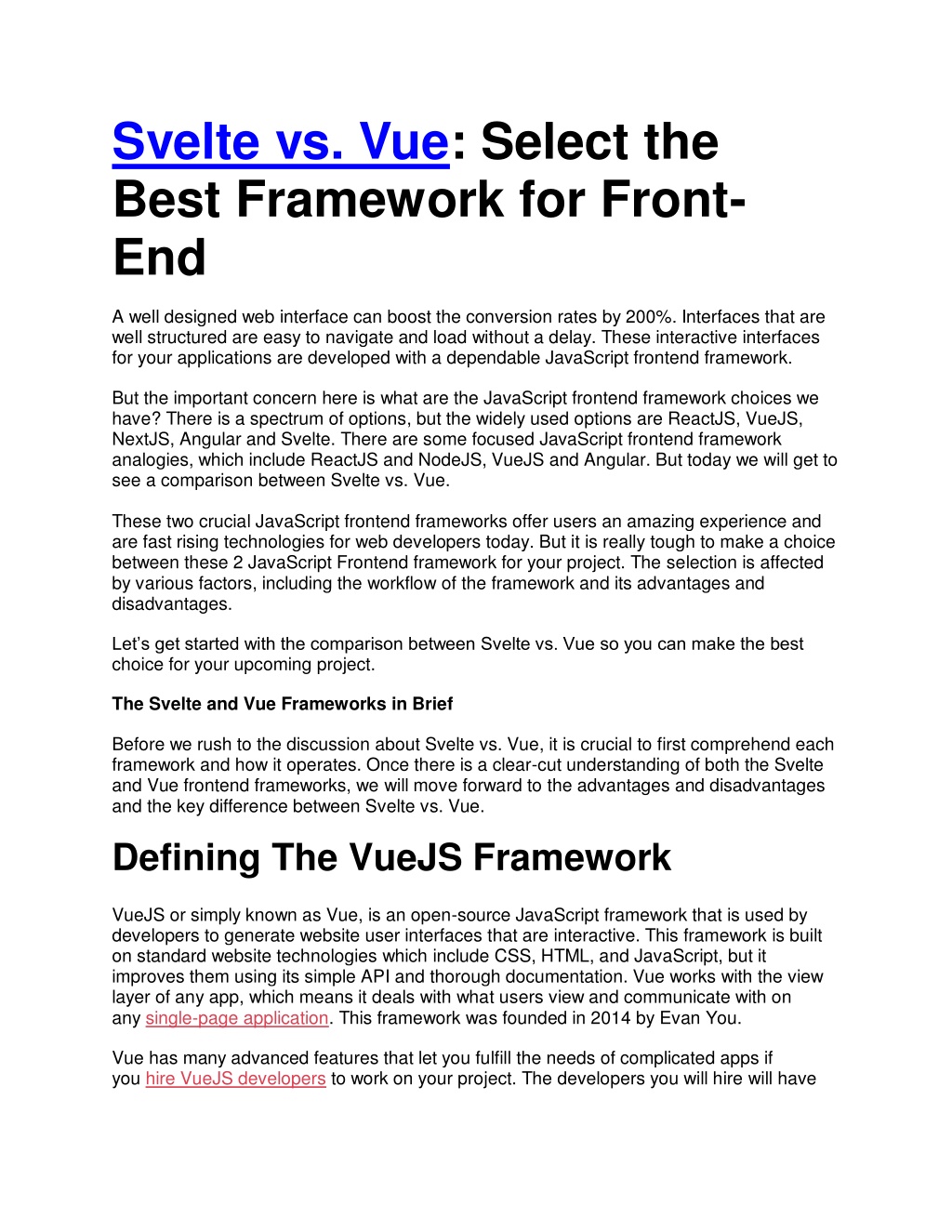 Svelte vs. Vue: Select the Best Framework for Front- End A well designed web interface can boost the conversion rates by 200%. Interfaces that are well structured are easy to navigate and load without a delay. These interactive interfaces for your applications are developed with a dependable JavaScript frontend framework. But the important concern here is what are the JavaScript frontend framework choices we have? There is a spectrum of options, but the widely used options are ReactJS, VueJS, NextJS, Angular and Svelte. There are some focused JavaScript frontend framework analogies, which include ReactJS and NodeJS, VueJS and Angular. But today we will get to see a comparison between Svelte vs. Vue. These two crucial JavaScript frontend frameworks offer users an amazing experience and are fast rising technologies for web developers today. But it is really tough to make a choice between these 2 JavaScript Frontend framework for your project. The selection is affected by various factors, including the workflow of the framework and its advantages and disadvantages. Let’s get started with the comparison between Svelte vs. Vue so you can make the best choice for your upcoming project. The Svelte and Vue Frameworks in Brief Before we rush to the discussion about Svelte vs. Vue, it is crucial to first comprehend each framework and how it operates. Once there is a clear-cut understanding of both the Svelte and Vue frontend frameworks, we will move forward to the advantages and disadvantages and the key difference between Svelte vs. Vue. Defining The VueJS Framework VueJS or simply known as Vue, is an open-source JavaScript framework that is used by developers to generate website user interfaces that are interactive. This framework is built on standard website technologies which include CSS, HTML, and JavaScript, but it improves them using its simple API and thorough documentation. Vue works with the view layer of any app, which means it deals with what users view and communicate with on any single-page application. This framework was founded in 2014 by Evan You. Vue has many advanced features that let you fulfill the needs of complicated apps if you hire VueJS developers to work on your project. The developers you will hire will have