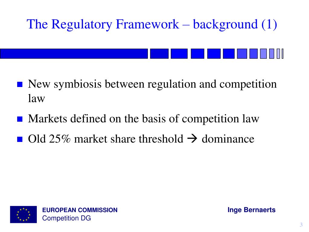 The Regulatory Framework – background (1) • New symbiosis between regulation and competition law • Markets defined on the basis of competition law • Old 25% market share threshold dominance