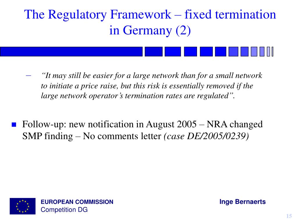 The Regulatory Framework – fixed termination in Germany (2) • “It may still be easier for a large network than for a small network to initiate a price raise, but this risk is essentially removed if the large network operator’s termination rates are regulated”. • Follow-up: new notification in August 2005 – NRA changed SMP finding – No comments letter (case DE/2005/0239)