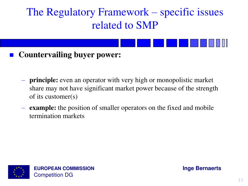 The Regulatory Framework – specific issues related to SMP • Countervailing buyer power: • principle: even an operator with very high or monopolistic market share may not have significant market power because of the strength of its customer(s) • example: the position of smaller operators on the fixed and mobile termination markets