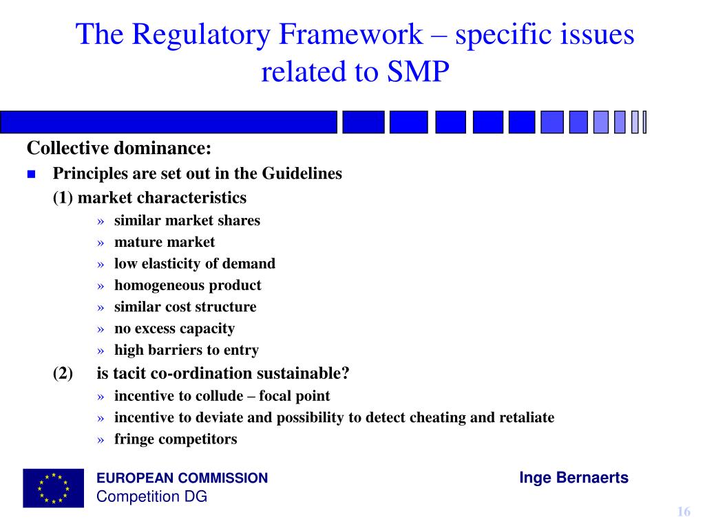 The Regulatory Framework – specific issues related to SMP Collective dominance: • Principles are set out in the Guidelines (1) market characteristics • similar market shares • mature market • low elasticity of demand • homogeneous product • similar cost structure • no excess capacity • high barriers to entry (2) is tacit co-ordination sustainable? • incentive to collude – focal point • incentive to deviate and possibility to detect cheating and retaliate • fringe competitors