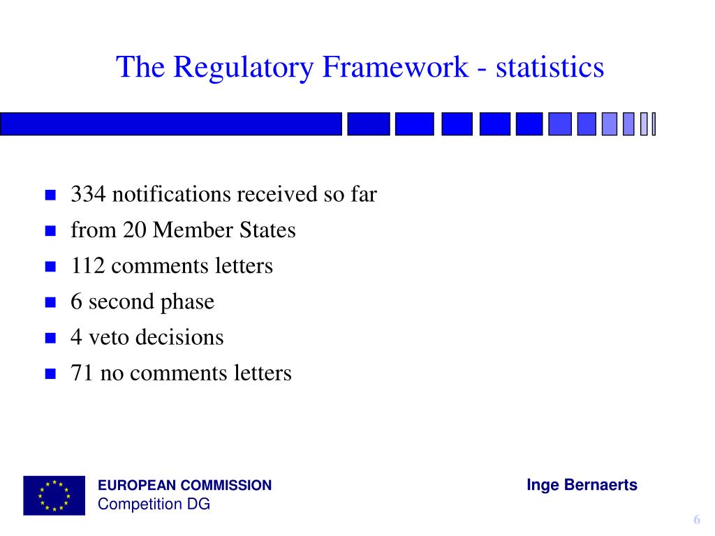 The Regulatory Framework - statistics • 334 notifications received so far • from 20 Member States • 112 comments letters • 6 second phase • 4 veto decisions • 71 no comments letters