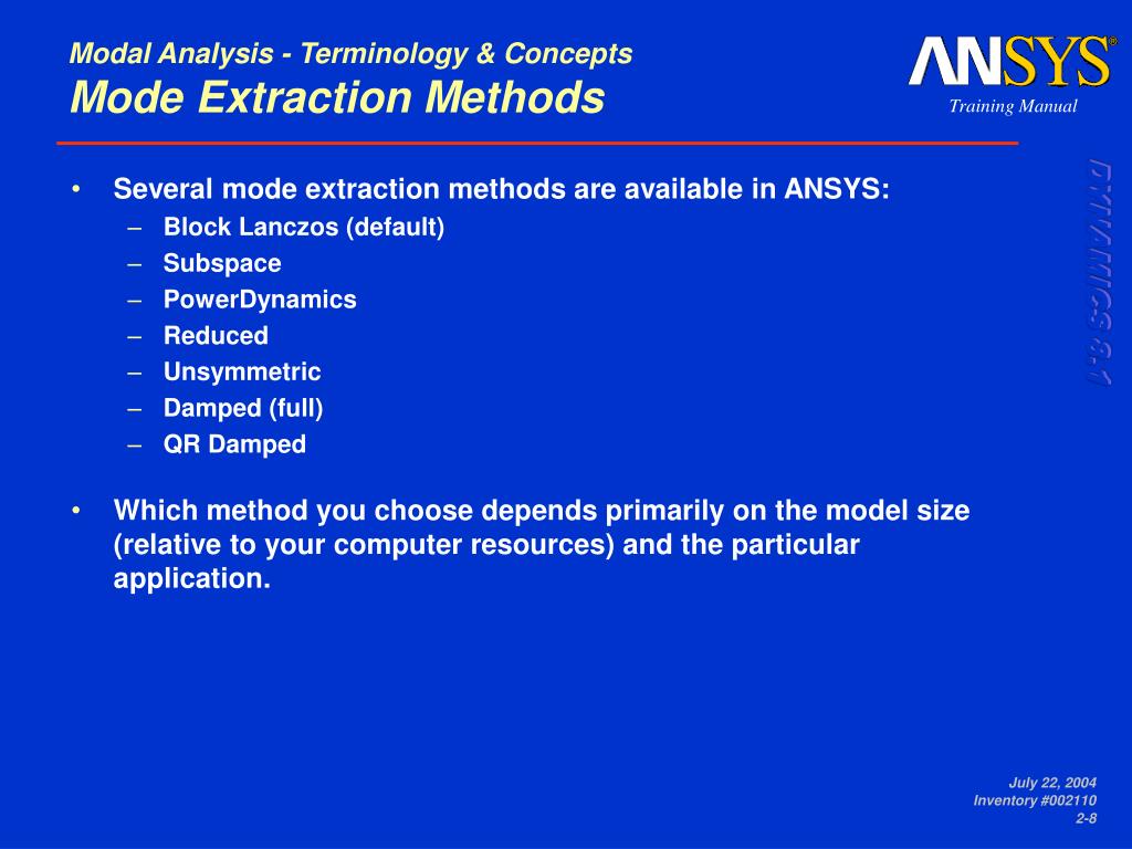 Modal Analysis - Terminology & ConceptsMode Extraction Methods • Several mode extraction methods are available in ANSYS: • Block Lanczos (default) • Subspace • PowerDynamics • Reduced • Unsymmetric • Damped (full) • QR Damped • Which method you choose depends primarily on the model size (relative to your computer resources) and the particular application. July 22, 2004 Inventory #002110 2-8
