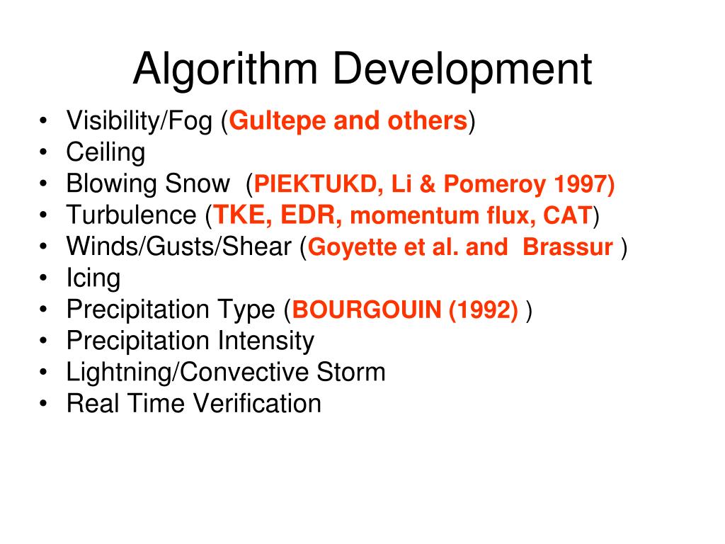 Algorithm Development • Visibility/Fog (Gultepe and others) • Ceiling • Blowing Snow (PIEKTUKD, Li & Pomeroy 1997) • Turbulence (TKE,EDR, momentum flux, CAT) • Winds/Gusts/Shear (Goyette et al. and Brassur ) • Icing • Precipitation Type (BOURGOUIN (1992) ) • Precipitation Intensity • Lightning/Convective Storm • Real Time Verification