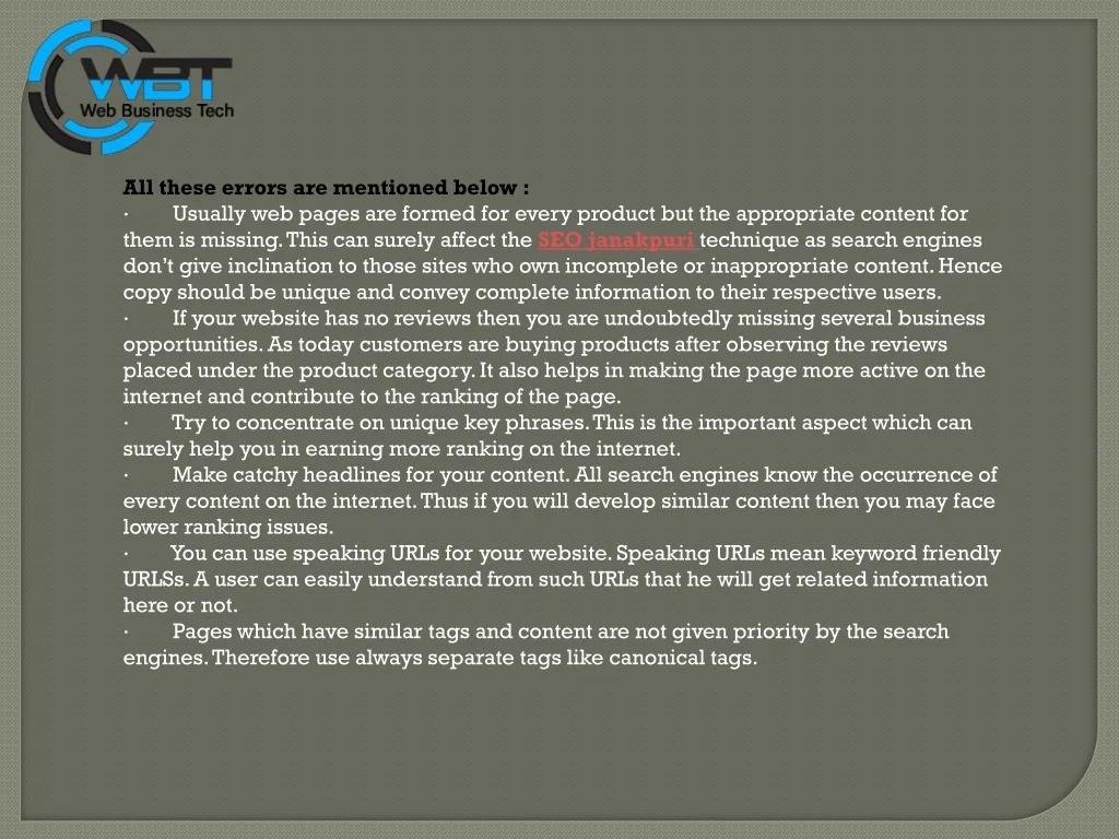 All these errors are mentioned below : · Usually web pages are formed for every product but the appropriate content for them is missing. This can surely affect the SEO janakpuri technique as search engines don’t give inclination to those sites who own incomplete or inappropriate content. Hence copy should be unique and convey complete information to their respective users. · If your website has no reviews then you are undoubtedly missing several business opportunities. As today customers are buying products after observing the reviews placed under the product category. It also helps in making the page more active on the internet and contribute to the ranking of the page. · Try to concentrate on unique key phrases. This is the important aspect which can surely help you in earning more ranking on the internet. · Make catchy headlines for your content. All search engines know the occurrence of every content on the internet. Thus if you will develop similar content then you may face lower ranking issues. · You can use speaking URLs for your website. Speaking URLs mean keyword friendly URLSs. A user can easily understand from such URLs that he will get related information here or not. · Pages which have similar tags and content are not given priority by the search engines. Therefore use always separate tags like canonical tags.