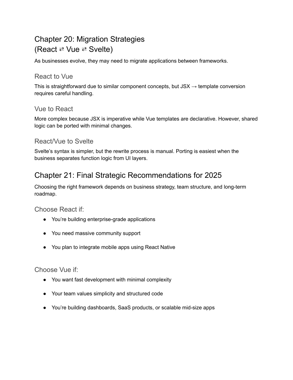 Chapter 20: Migration Strategies (React ⇄ Vue ⇄ Svelte) As businesses evolve, they may need to migrate applications between frameworks. React to Vue This is straightforward due to similar component concepts, but JSX → template conversion requires careful handling. Vue to React More complex because JSX is imperative while Vue templates are declarative. However, shared logic can be ported with minimal changes. React/Vue to Svelte Svelte’s syntax is simpler, but the rewrite process is manual. Porting is easiest when the business separates function logic from UI layers. Chapter 21: Final Strategic Recommendations for 2025 Choosing the right framework depends on business strategy, team structure, and long-term roadmap. Choose React if: ● You’re building enterprise-grade applications ● You need massive community support ● You plan to integrate mobile apps using React Native Choose Vue if: ● You want fast development with minimal complexity ● Your team values simplicity and structured code ● You’re building dashboards, SaaS products, or scalable mid-size apps