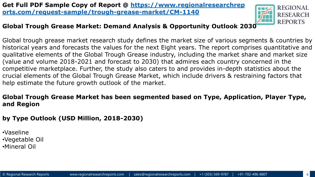 Market Research Report EXCLUSIVE EDITION Global Trough Grease Market Report Opportunities, and Forecast By 2030 Global Industry Analysis, Forecast and Trends, 2022-2030 © Regional Research Reports www.regionalresearchreports.com | sales@regionalresearchreports.com | +1 (303) 569-9787 | +91-702-496-8807