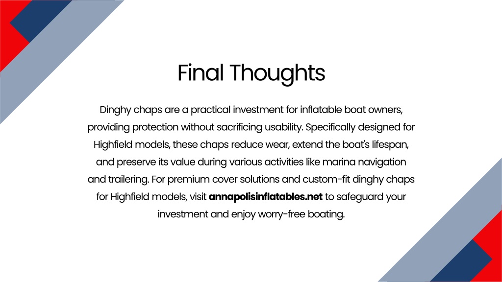 Owning an inflatable dinghy provides freedom on the water, but it also requires protecting your investment from UV exposure, abrasion, and frequent docking. These chaps for highfield dinghy serve as protective covers for inflatable tubes, offering practical benefits that enhance both performance and longevity. For Highfield boat owners, highfield dinghy chaps have become an essential upgrade rather than just an optional accessory. To learn more about the advantages of dinghy chaps, check out this PPT!<br>For more details, visit Annapolis Inflatables or https://annapolisinflatables.net/products/ch