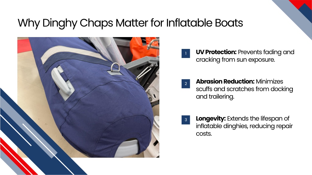 1 2 3 Why Dinghy Chaps Matter for Inflatable Boats UV Protection: Prevents fading and cracking from sun exposure. Abrasion Reduction: Minimizes scuffs and scratches from docking and trailering. Longevity: Extends the lifespan of inflatable dinghies, reducing repair costs.