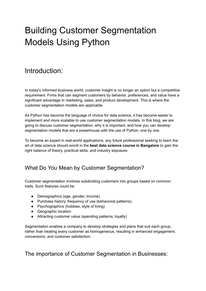 Building Customer Segmentation Models Using Python Introduction: In today's informed business world, customer insight is no longer an option but a competitive requirement. Firms that can segment customers by behavior, preferences, and value have a significant advantage in marketing, sales, and product development. This is where the customer segmentation models are applicable. As Python has become the language of choice for data science, it has become easier to implement and more scalable to use customer segmentation models. In this blog, we are going to discuss customer segmentation, why it is important, and how you can develop segmentation models that are a powerhouse with the use of Python, one by one. To become an expert in real-world applications, any future professional seeking to learn the art of data science should enroll in the best data science course in Bangalore to gain the right balance of theory, practical skills, and industry exposure. What Do You Mean by Customer Segmentation? Customer segmentation involves subdividing customers into groups based on common traits. Such features could be: ● Demographics (age, gender, income). ● Purchase history, frequency of use (behavioral patterns). ● Psychographics (hobbies, style of living) ● Geographic location ● Attracting customer value (spending patterns, loyalty) Segmentation enables a company to develop strategies and plans that suit each group, rather than treating every customer as homogeneous, resulting in enhanced engagement, conversions, and customer satisfaction. The importance of Customer Segmentation in Businesses: