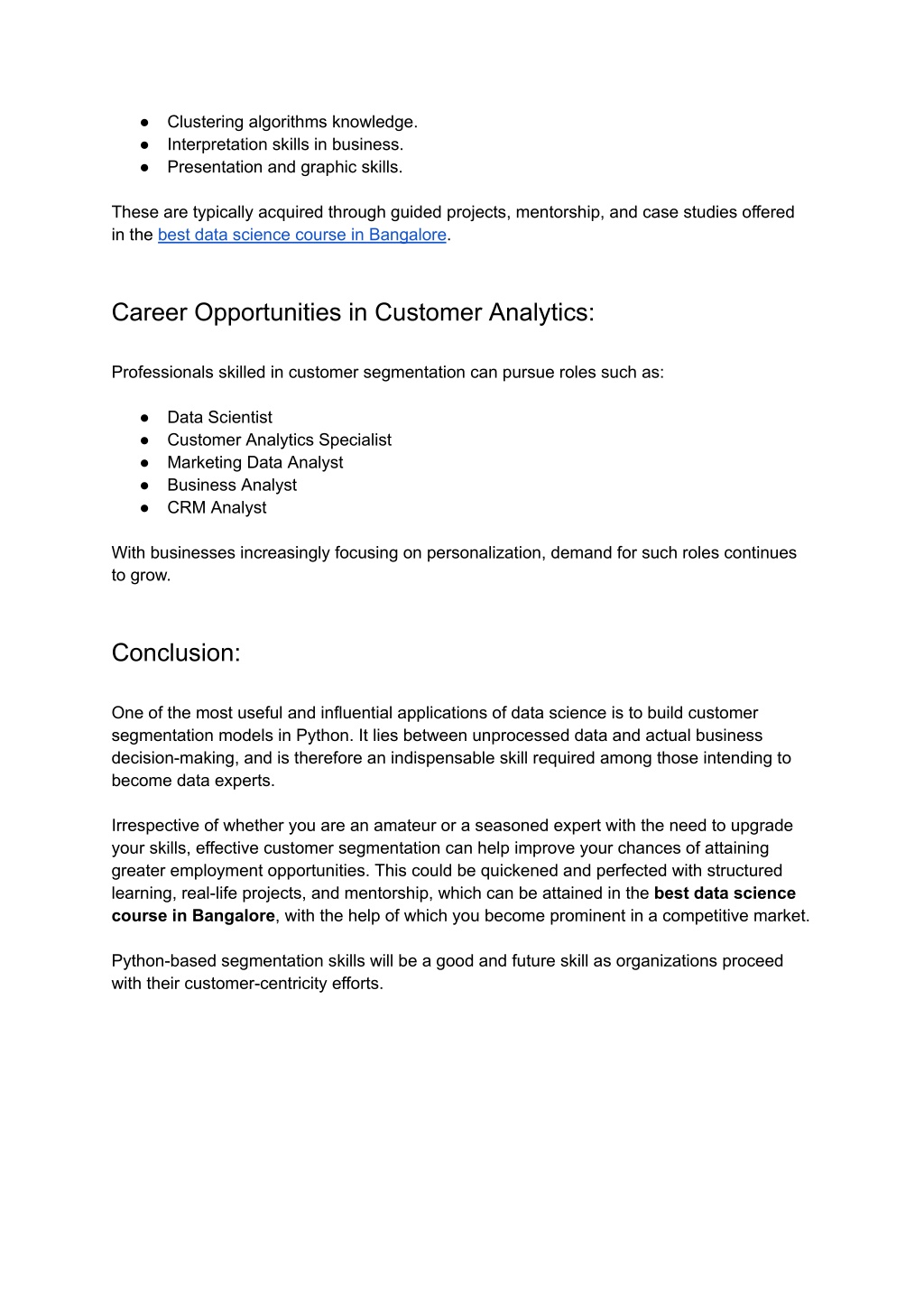 ● Clustering algorithms knowledge. ● Interpretation skills in business. ● Presentation and graphic skills. These are typically acquired through guided projects, mentorship, and case studies offered in the best data science course in Bangalore. Career Opportunities in Customer Analytics: Professionals skilled in customer segmentation can pursue roles such as: ● Data Scientist ● Customer Analytics Specialist ● Marketing Data Analyst ● Business Analyst ● CRM Analyst With businesses increasingly focusing on personalization, demand for such roles continues to grow. Conclusion: One of the most useful and influential applications of data science is to build customer segmentation models in Python. It lies between unprocessed data and actual business decision-making, and is therefore an indispensable skill required among those intending to become data experts. Irrespective of whether you are an amateur or a seasoned expert with the need to upgrade your skills, effective customer segmentation can help improve your chances of attaining greater employment opportunities. This could be quickened and perfected with structured learning, real-life projects, and mentorship, which can be attained in the best data science course in Bangalore, with the help of which you become prominent in a competitive market. Python-based segmentation skills will be a good and future skill as organizations proceed with their customer-centricity efforts.