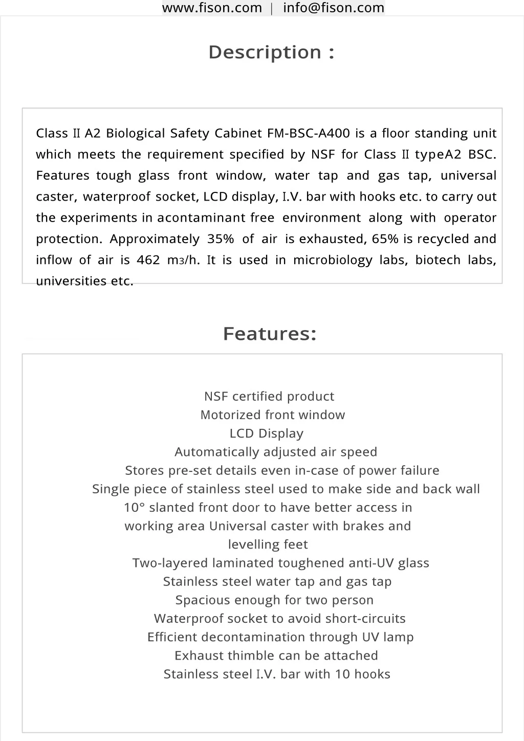www.fison.com | info@fison.com Description : Class II A2 Biological Safety Cabinet FM-BSC-A400 is a floor standing unit which meets the requirement specified by NSF for Class II typeA2 BSC. Features tough glass front window, water tap and gas tap, universal caster, waterproof socket, LCD display, I.V. bar with hooks etc. to carry out the experiments in acontaminant free environment along with operator protection. Approximately 35% of air is exhausted, 65% is recycled and inflow of air is 462 m3/h. It is used in microbiology labs, biotech labs, universities etc. Features: NSF certified product Motorized front window LCD Display Automatically adjusted air speed Stores pre-set details even in-case of power failure Single piece of stainless steel used to make side and back wall 10° slanted front door to have better access in working area Universal caster with brakes and levelling feet Two-layered laminated toughened anti-UV glass Stainless steel water tap and gas tap Spacious enough for two person Waterproof socket to avoid short-circuits Efficient decontamination through UV lamp Exhaust thimble can be attached Stainless steel I.V. bar with 10 hooks