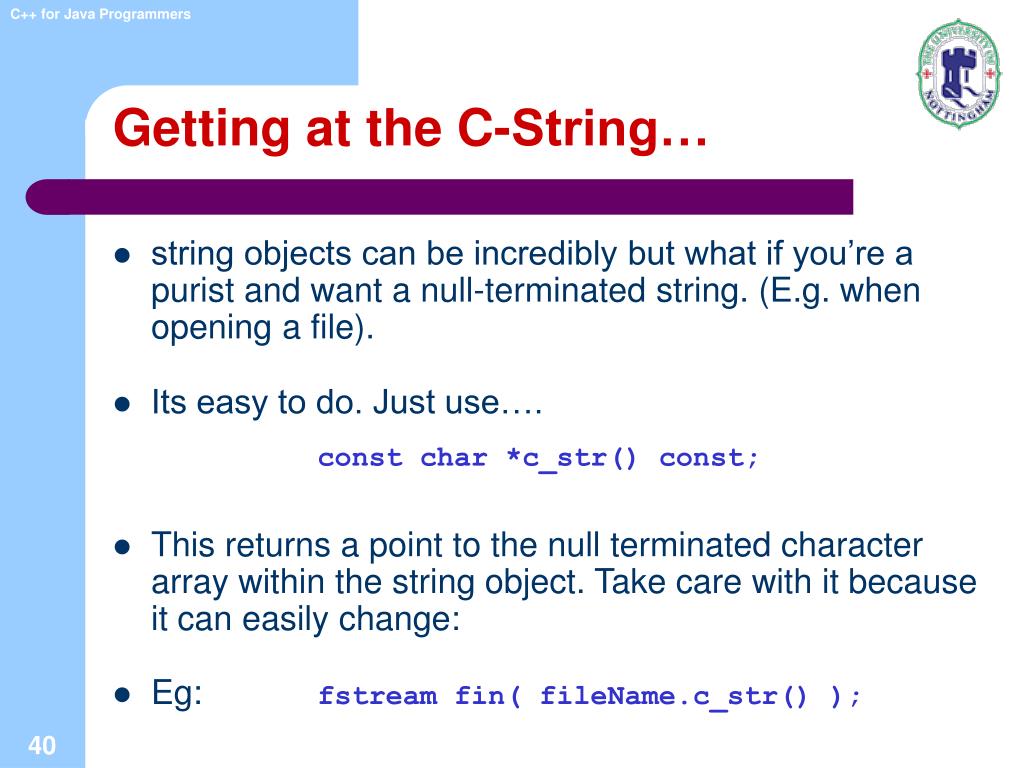 Getting at the C-String… • string objects can be incredibly but what if you’re a purist and want a null-terminated string. (E.g. when opening a file). • Its easy to do. Just use…. const char *c_str() const; • This returns a point to the null terminated character array within the string object. Take care with it because it can easily change: • Eg: fstream fin( fileName.c_str() );