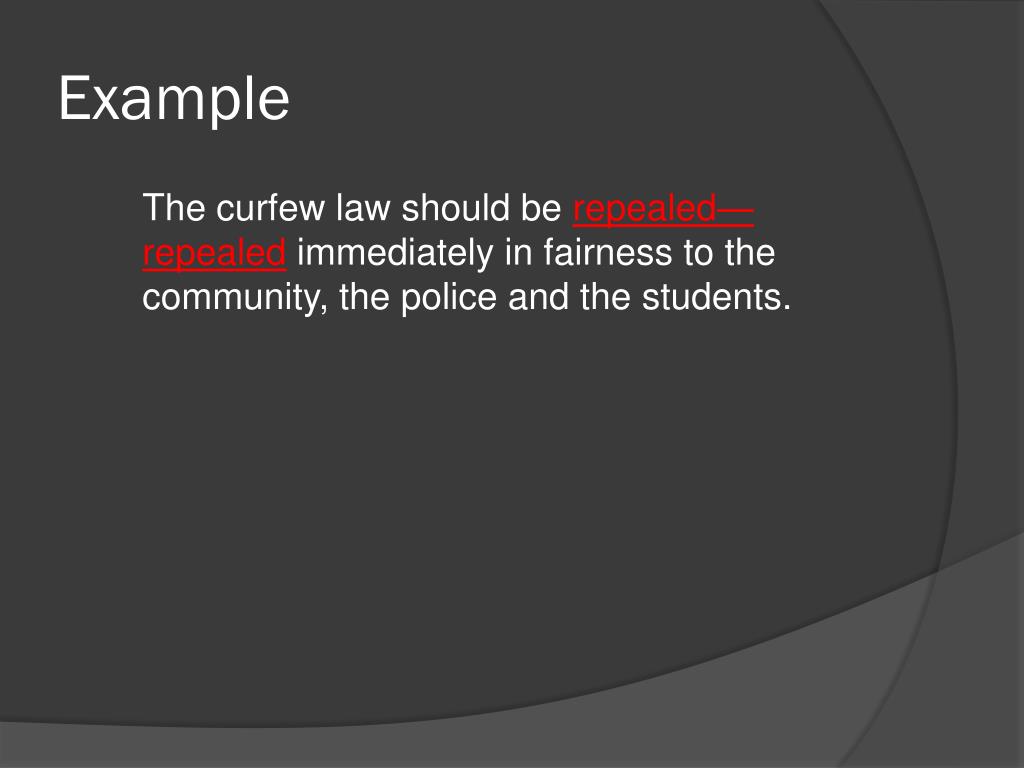 Example The curfew law should be repealed—repealed immediately in fairness to the community, the police and the students.