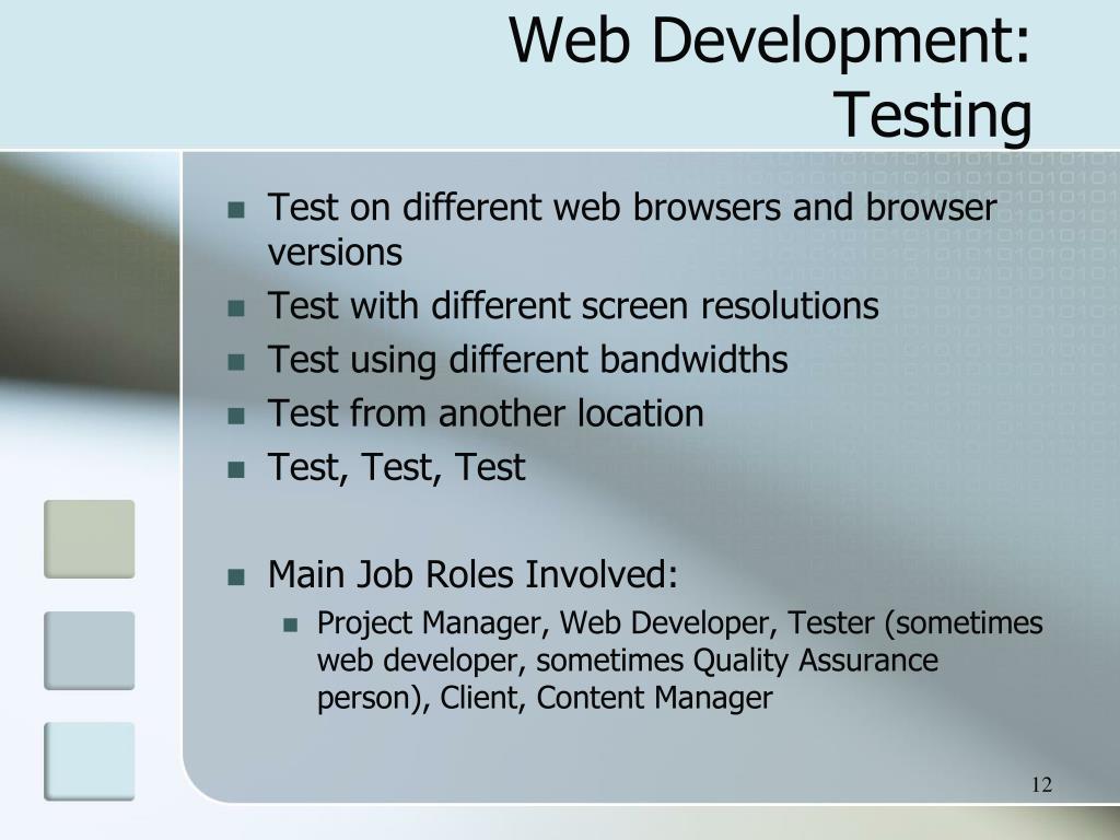 Web Development: Testing • Test on different web browsers and browser versions • Test with different screen resolutions • Test using different bandwidths • Test from another location • Test, Test, Test • Main Job Roles Involved: • Project Manager, Web Developer, Tester (sometimes web developer, sometimes Quality Assurance person), Client, Content Manager