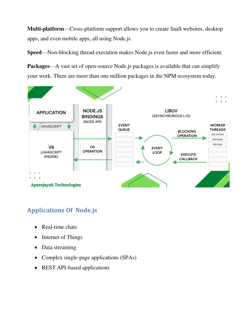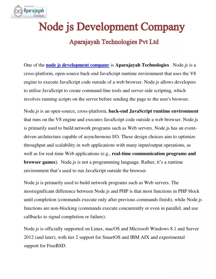 Node js Development Company Node js Development Company Aparajayah Technologies Pvt Ltd Aparajayah Technologies Pvt Ltd One of the node js development company is Aparajayah Technologies. Node.js is a cross-platform, open-source back-end JavaScript runtime environment that uses the V8 engine to execute JavaScript code outside of a web browser. Node.js allows developers to utilise JavaScript to create command-line tools and server-side scripting, which involves running scripts on the server before sending the page to the user's browser. Node.js is an open-source, cross-platform, back-end JavaScript runtime environment that runs on the V8 engine and executes JavaScript code outside a web browser. Node.js is primarily used to build network programs such as Web servers. Node.js has an event- driven architecture capable of asynchronous I/O. These design choices aim to optimize throughput and scalability in web applications with many input/output operations, as well as for real-time Web applications (e.g., real-time communication programs and browser games). Node.js is not a programming language. Rather, it’s a runtime environment that’s used to run JavaScript outside the browser. Node.js is primarily used to build network programs such as Web servers. The mostsignificant difference between Node.js and PHP is that most functions in PHP block until completion (commands execute only after previous commands finish), while Node.js functions are non-blocking (commands execute concurrently or even in parallel, and use callbacks to signal completion or failure). Node.js is officially supported on Linux, macOS and Microsoft Windows 8.1 and Server 2012 (and later), with tier 2 support for SmartOS and IBM AIX and experimental support for FreeBSD.