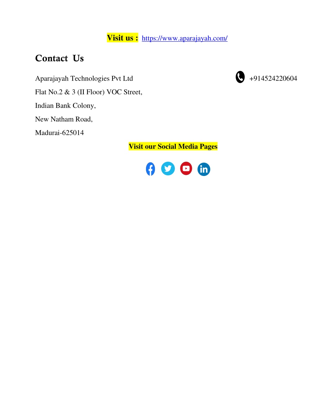 Visit us : https://www.aparajayah.com/ Contact Us Aparajayah Technologies Pvt Ltd +914524220604 Flat No.2 & 3 (II Floor) VOC Street, Indian Bank Colony, New Natham Road, Madurai-625014 Visit our Social Media Pages