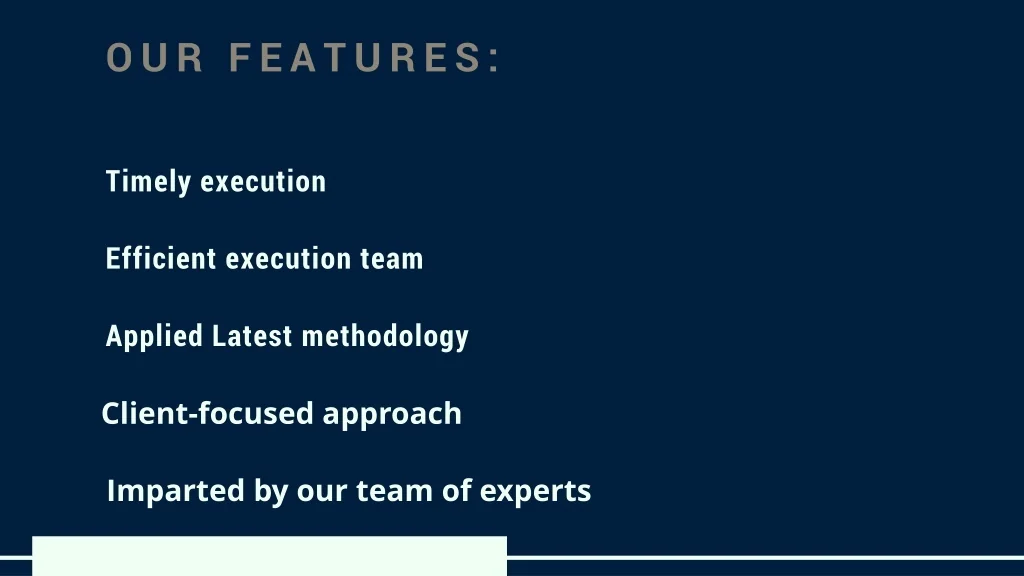 OUR FEATURES: Timely execution Efficient execution team Applied Latest methodology Client-focused approach Imparted by our team of experts