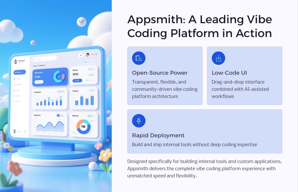 3. Appsmith: A Leading Vibe Coding Platform in Action Open-Source Power Low-Code UI Transparent, flexible, and community-driven vibe coding platform architecture Drag-and-drop interface combined with AI-assisted workflows Rapid Deployment Build and ship internal tools without deep coding expertise Designed specifically for building internal tools and custom applications, Appsmith delivers the complete vibe coding platform experience with unmatched speed and flexibility.