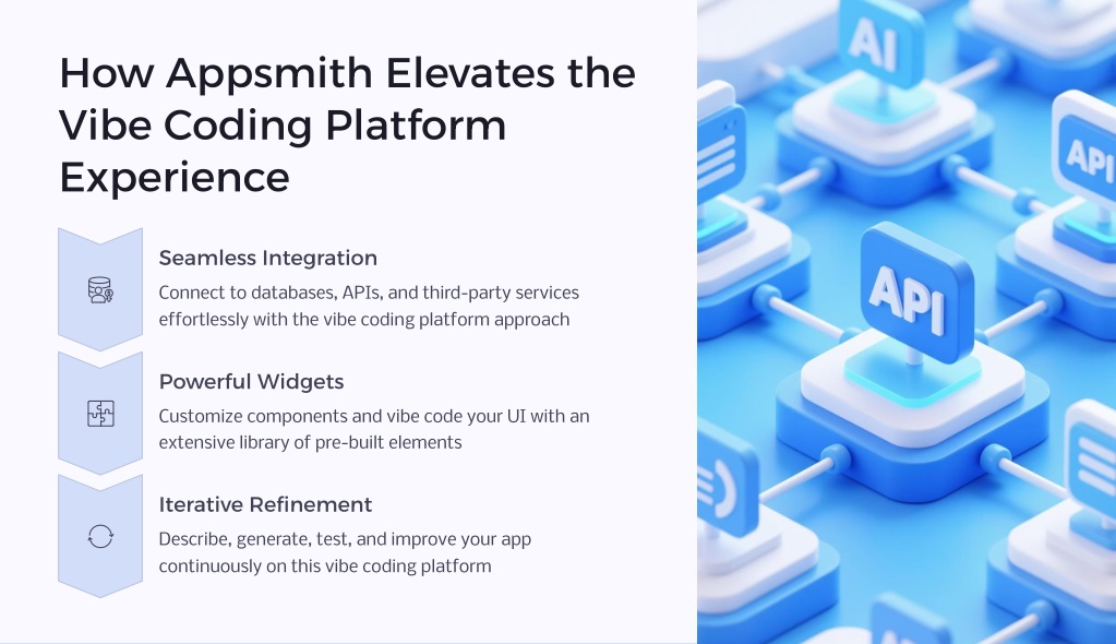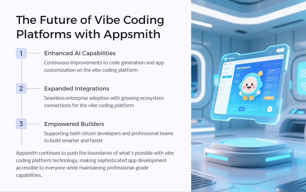 6. The Future of Vibe Coding Platforms with Appsmith 1 Enhanced AI Capabilities Continuous improvements to code generation and app customization on the vibe coding platform 2 Expanded Integrations Seamless enterprise adoption with growing ecosystem connections for the vibe coding platform 3 Empowered Builders Supporting both citizen developers and professional teams to build smarter and faster Appsmith continues to push the boundaries of what's possible with vibe coding platform technology, making sophisticated app development accessible to everyone while maintaining professional-grade capabilities.