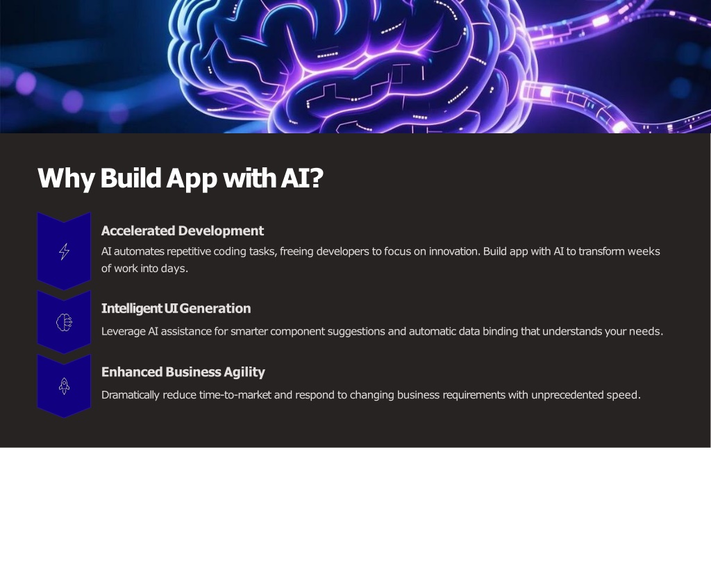 3. WhyBuildAppwithAI? AcceleratedDevelopment AIautomatesrepetitivecodingtasks,freeingdeveloperstofocusoninnovation.BuildappwithAItotransformweeks ofworkintodays. IntelligentUIGeneration LeverageAIassistanceforsmartercomponentsuggestionsandautomaticdatabinding thatunderstandsyourneeds. EnhancedBusinessAgility Dramaticallyreducetime-to-marketandrespond tochangingbusinessrequirementswithunprecedentedspeed.