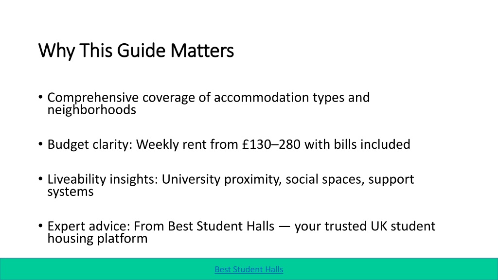 Why This Guide Matters Why This Guide Matters • Comprehensive coverage of accommodation types and neighborhoods • Budget clarity: Weekly rent from £130–280 with bills included • Liveability insights: University proximity, social spaces, support systems • Expert advice: From Best Student Halls — your trusted UK student housing platform Best Student Halls