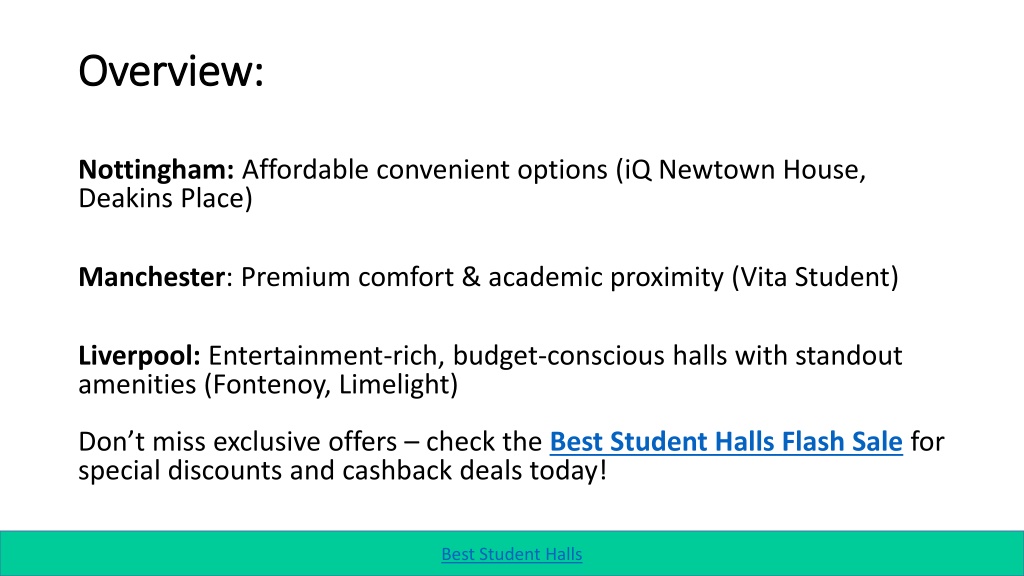 Overview: Overview: Nottingham: Affordable convenient options (iQ Newtown House, Deakins Place) Manchester: Premium comfort & academic proximity (Vita Student) Liverpool: Entertainment-rich, budget-conscious halls with standout amenities (Fontenoy, Limelight) Don’t miss exclusive offers – check the Best Student Halls Flash Sale for special discounts and cashback deals today! Best Student Halls