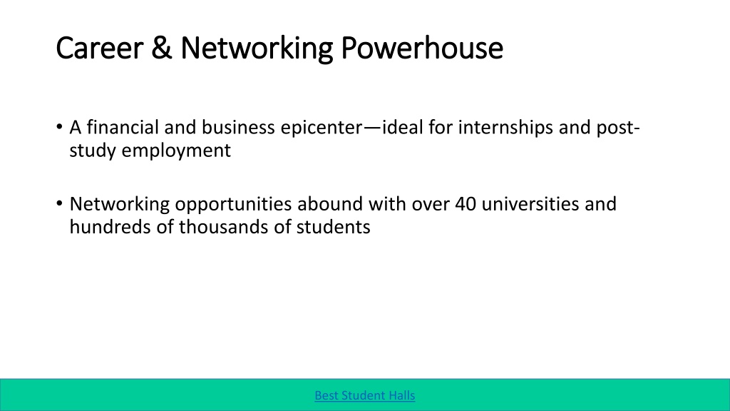 Career & Networking Powerhouse Career & Networking Powerhouse • A financial and business epicenter—ideal for internships and post- study employment • Networking opportunities abound with over 40 universities and hundreds of thousands of students Best Student Halls