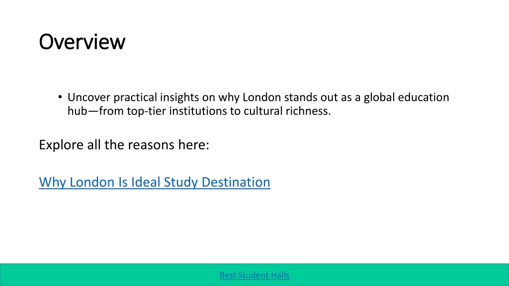 Overview Overview • Uncover practical insights on why London stands out as a global education hub—from top-tier institutions to cultural richness. Explore all the reasons here: Why London Is Ideal Study Destination Best Student Halls