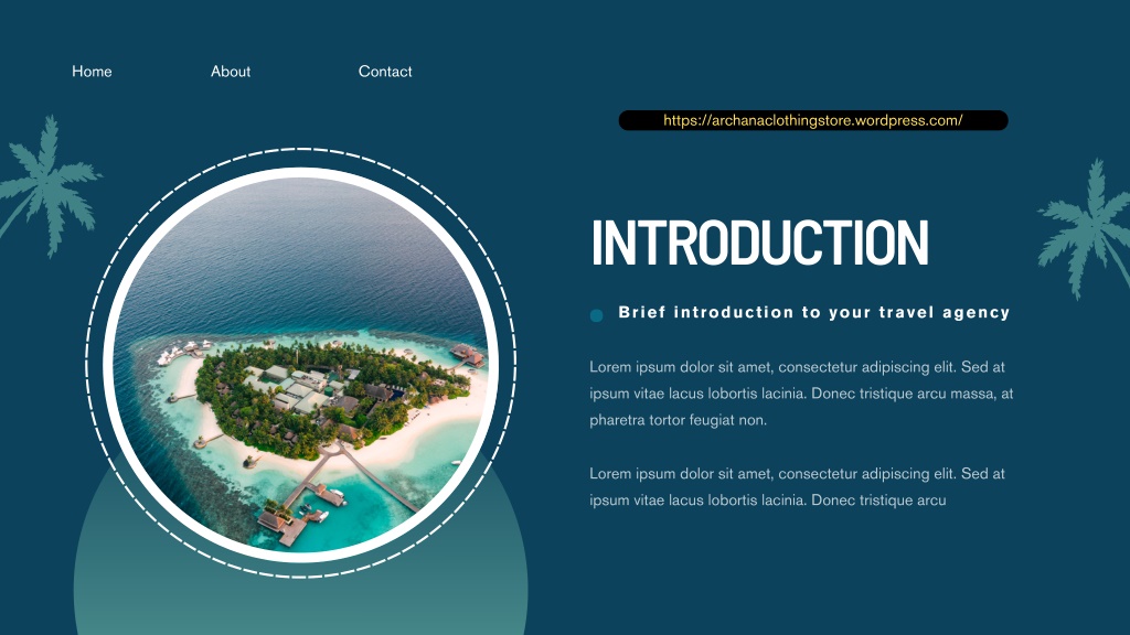 2. Home About Contact https://archanaclothingstore.wordpress.com/ INTRODUCTION Brief introduction to your travel agency Lorem ipsum dolor sit amet, consectetur adipiscing elit. Sed at ipsum vitae lacus lobortis lacinia. Donec tristique arcu massa, at pharetra tortor feugiat non. Lorem ipsum dolor sit amet, consectetur adipiscing elit. Sed at ipsum vitae lacus lobortis lacinia. Donec tristique arcu