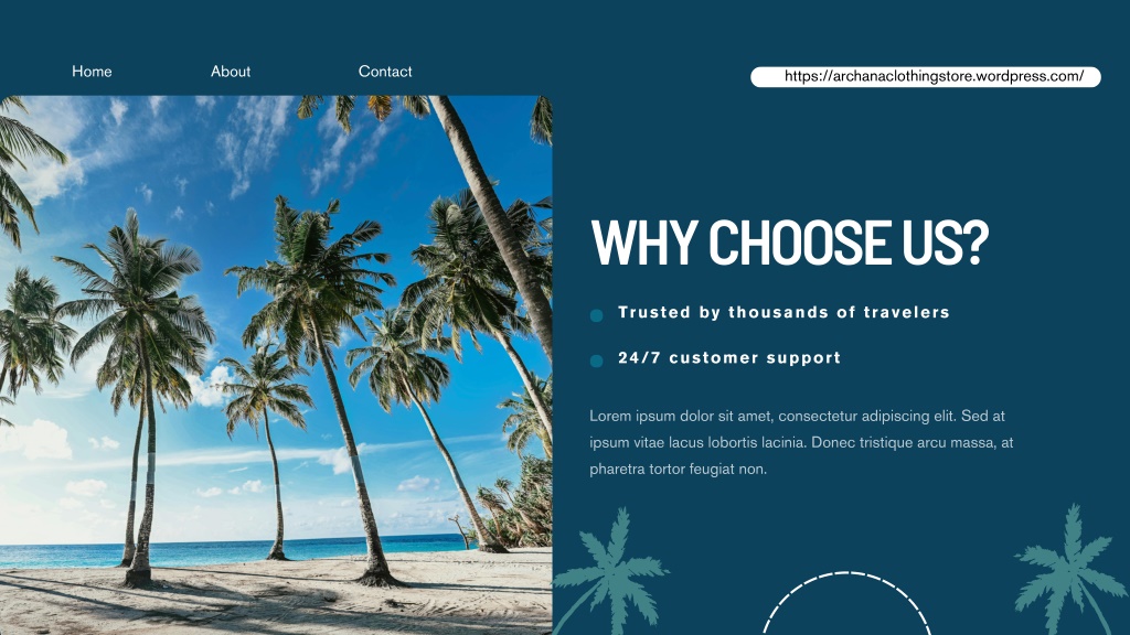 4. Home About Contact https://archanaclothingstore.wordpress.com/ WHY CHOOSE US? Trusted by thousands of travelers 24/7 customer support Lorem ipsum dolor sit amet, consectetur adipiscing elit. Sed at ipsum vitae lacus lobortis lacinia. Donec tristique arcu massa, at pharetra tortor feugiat non.