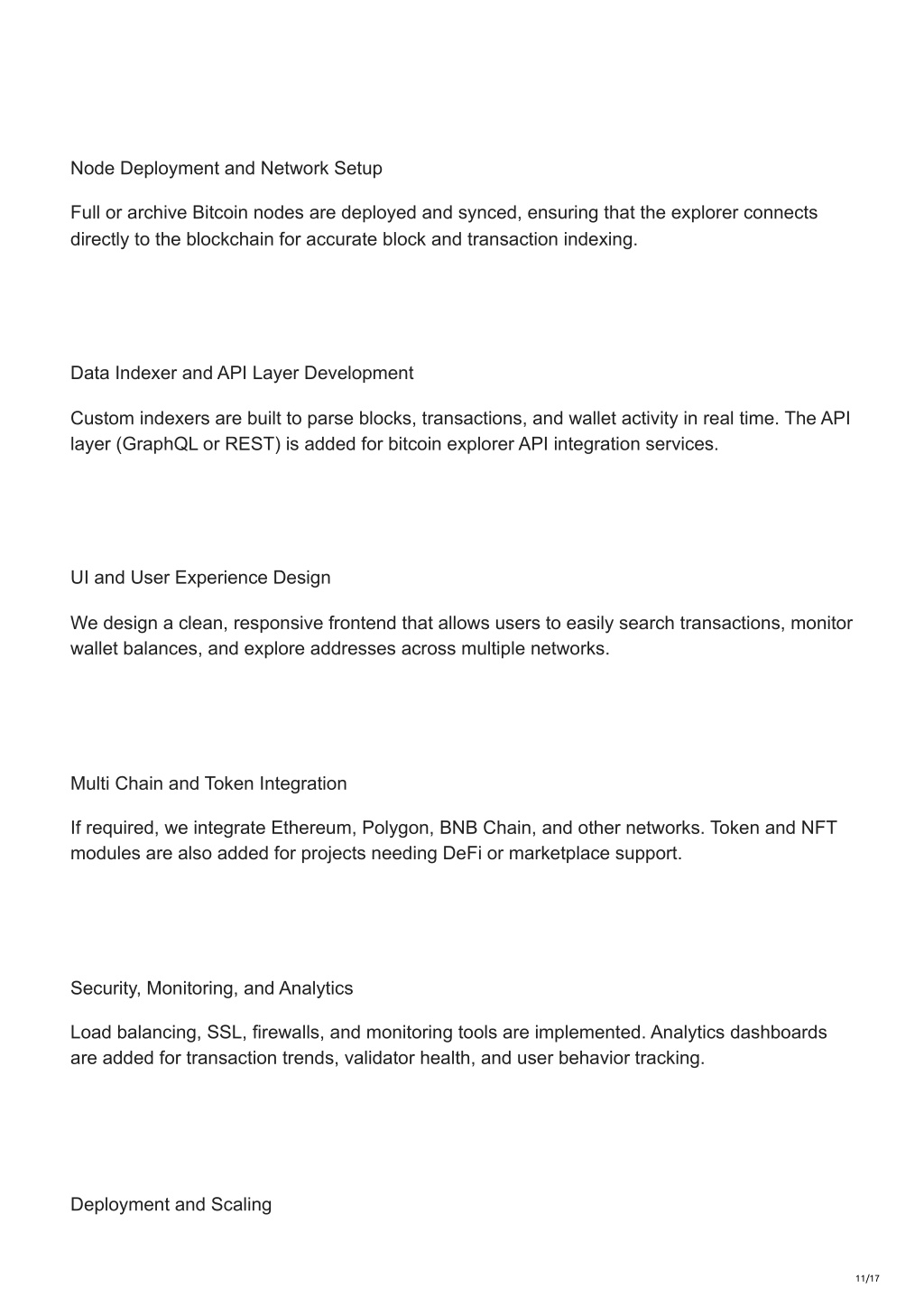 11. Node Deployment and Network Setup Full or archive Bitcoin nodes are deployed and synced, ensuring that the explorer connects directly to the blockchain for accurate block and transaction indexing. Data Indexer and API Layer Development Custom indexers are built to parse blocks, transactions, and wallet activity in real time. The API layer (GraphQL or REST) is added for bitcoin explorer API integration services. UI and User Experience Design We design a clean, responsive frontend that allows users to easily search transactions, monitor wallet balances, and explore addresses across multiple networks. Multi Chain and Token Integration If required, we integrate Ethereum, Polygon, BNB Chain, and other networks. Token and NFT modules are also added for projects needing DeFi or marketplace support. Security, Monitoring, and Analytics Load balancing, SSL, firewalls, and monitoring tools are implemented. Analytics dashboards are added for transaction trends, validator health, and user behavior tracking. Deployment and Scaling 11/17