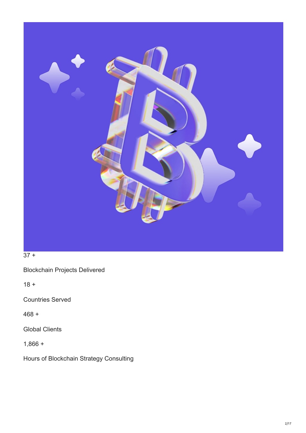 2. 37 + Blockchain Projects Delivered 18 + Countries Served 468 + Global Clients 1,866 + Hours of Blockchain Strategy Consulting 2/17